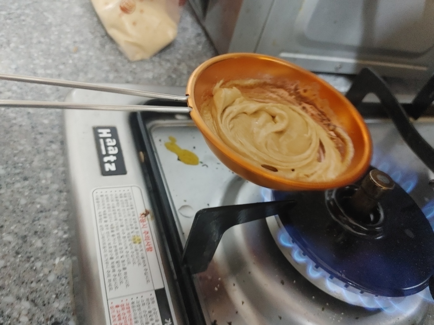설탕은 흰색이 좋은데 집에 황설탕이 있어 얘로 우선 해먹어보려고 한다. 열심히 녹인 후 설탕이 물처럼 되면 식소다를 한 꼬집 넣어준다.
