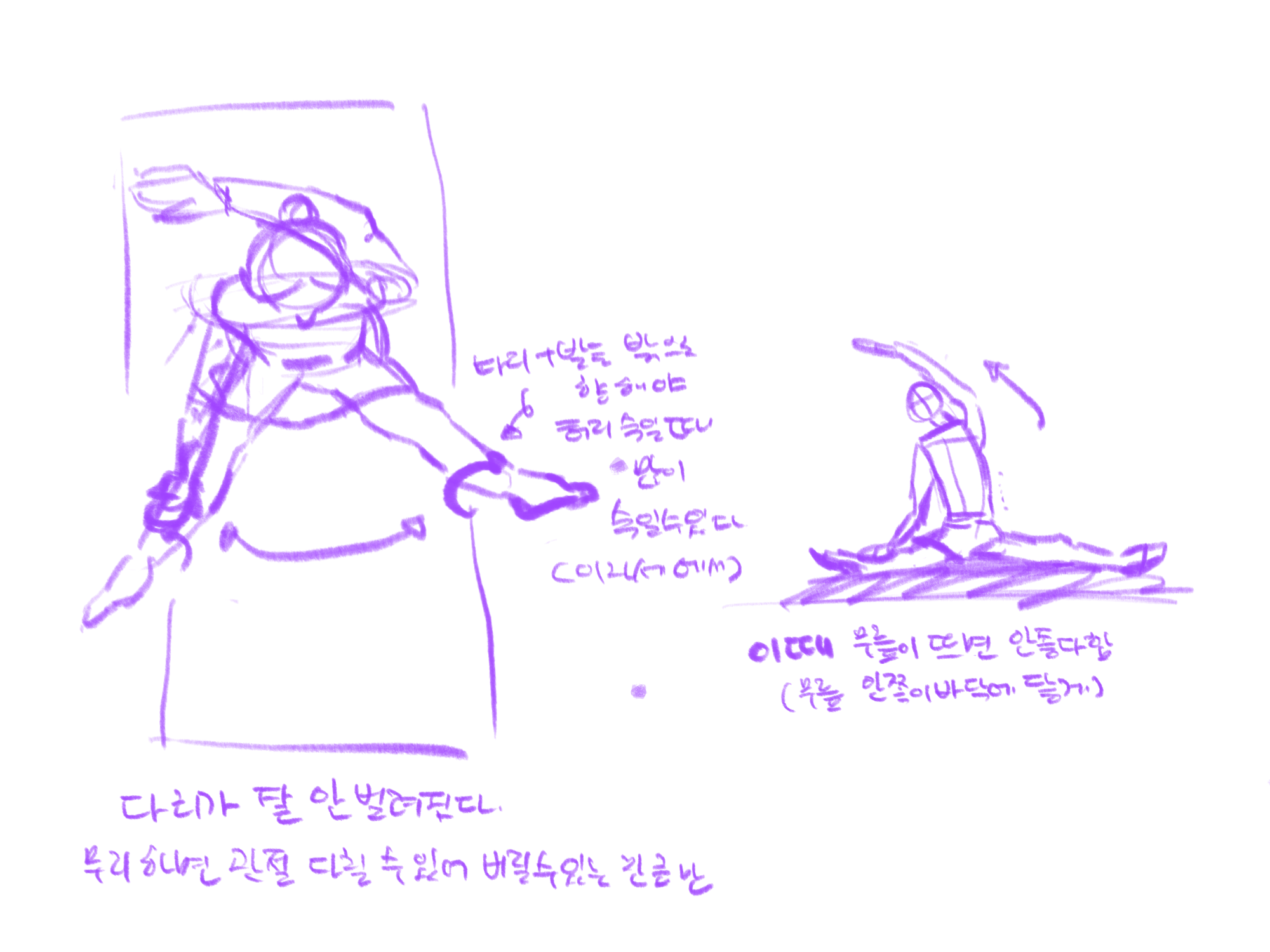 다리 벌리고 옆 스트레칭 아놔 중간중간 다른 동작이 있지만 너무 고통스러워서 얘만 기억나 그림으로 꾸역꾸역 그려서 남긴다.