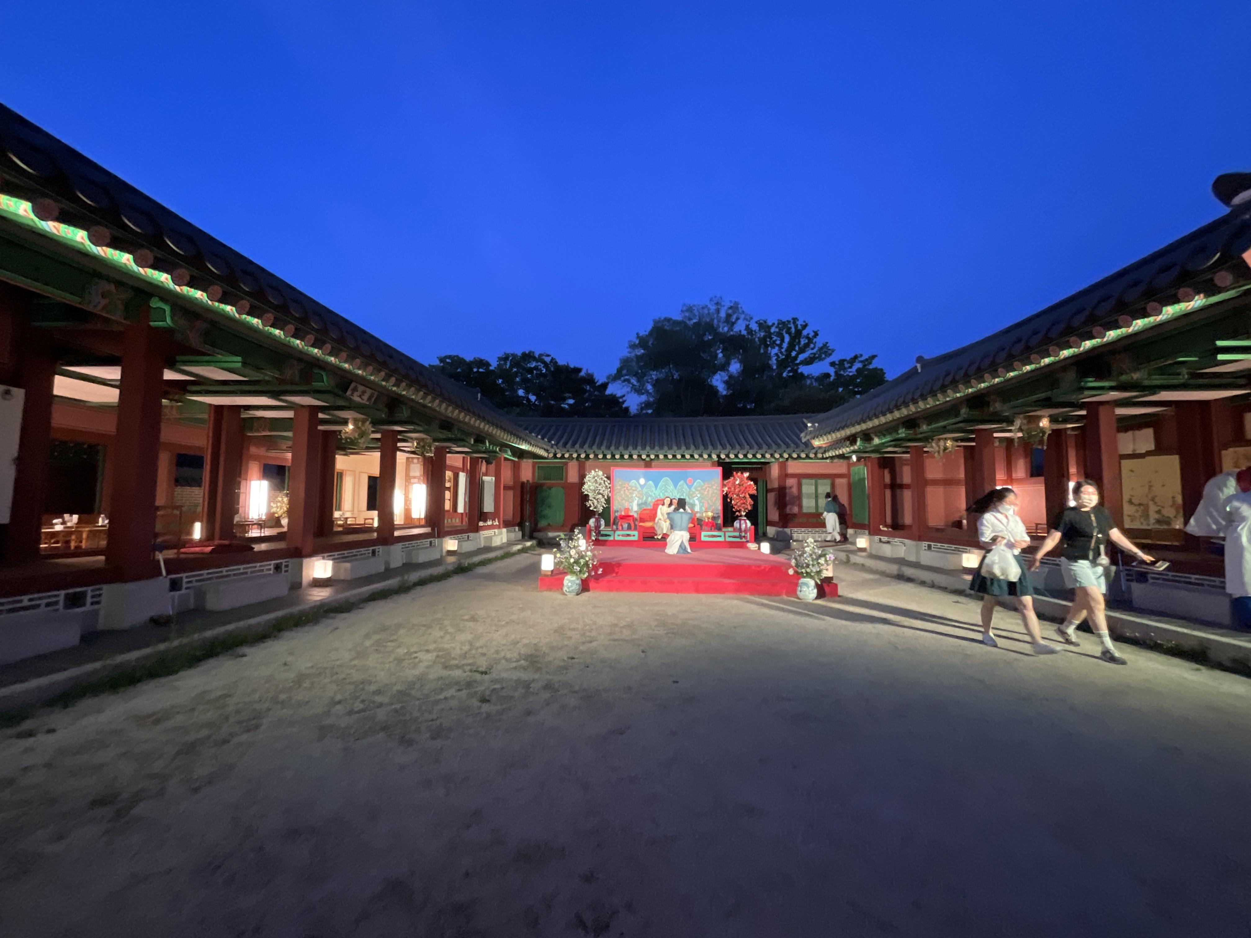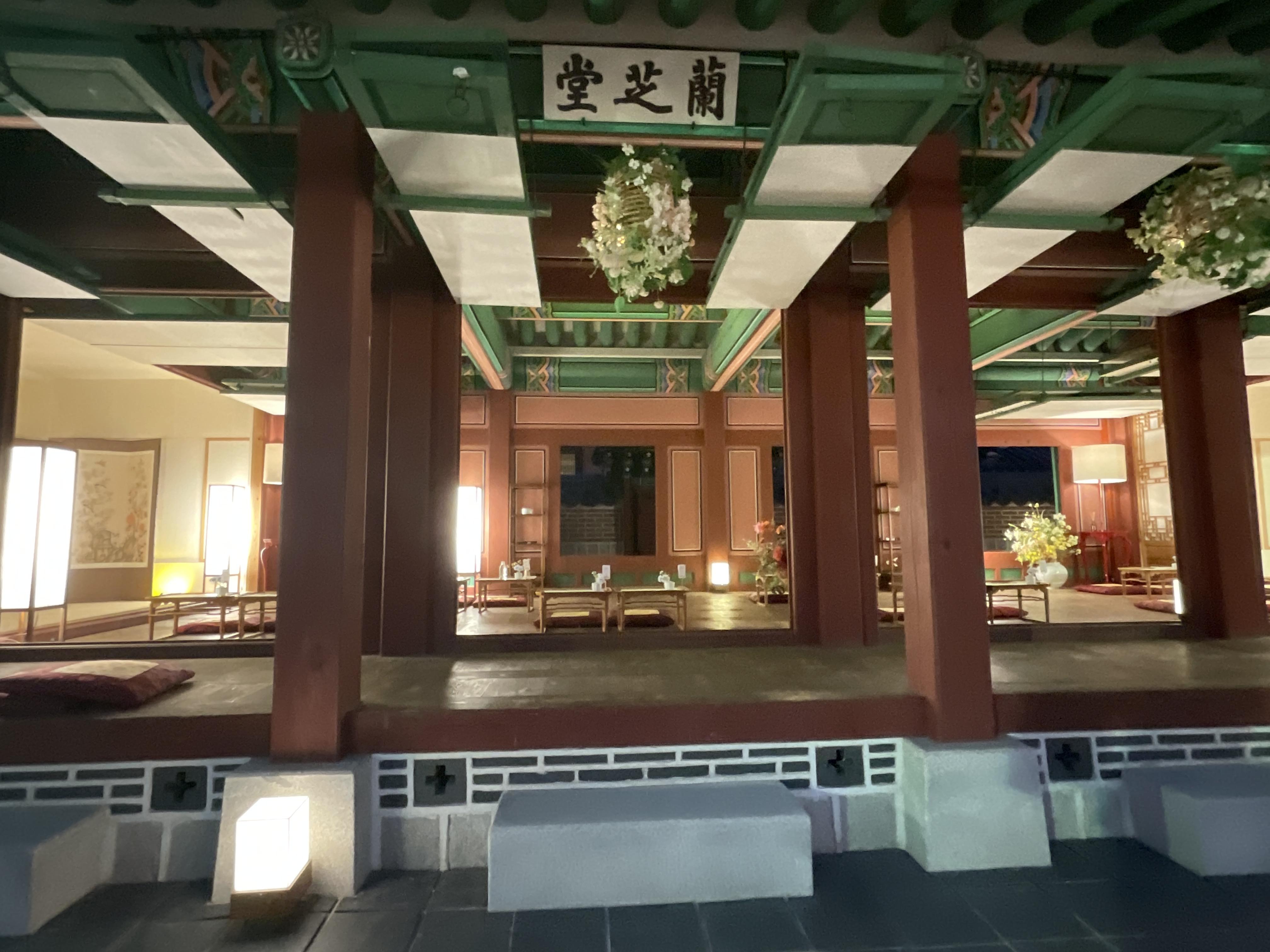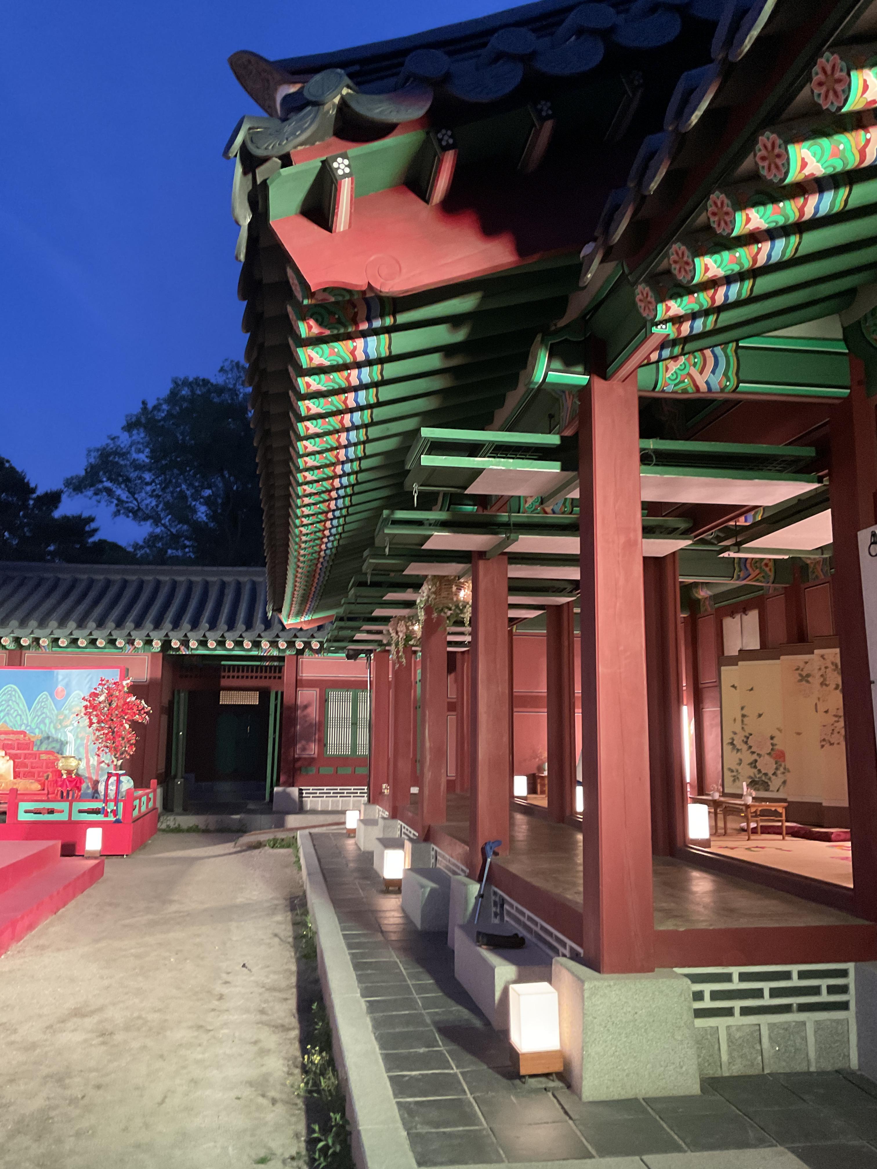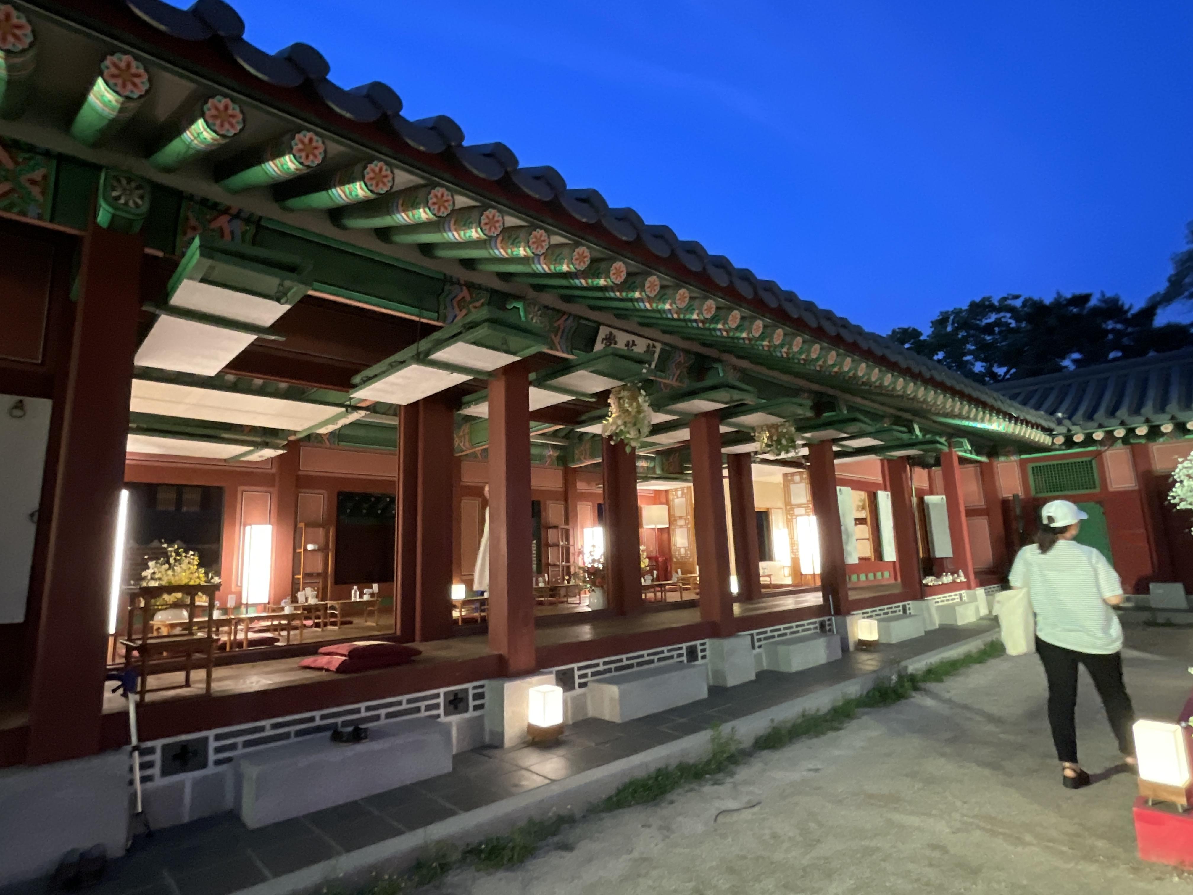 식사를 다 끝나고 난 뒤, 사람들빠지고 궁을 찍는데 야간에 보는데 너무 예뻐 여기저기 찍었다. 의자에는 앉아서 찍는게 부담스러워 의자와 궁 방만 곳곳 찍고 나왔다.