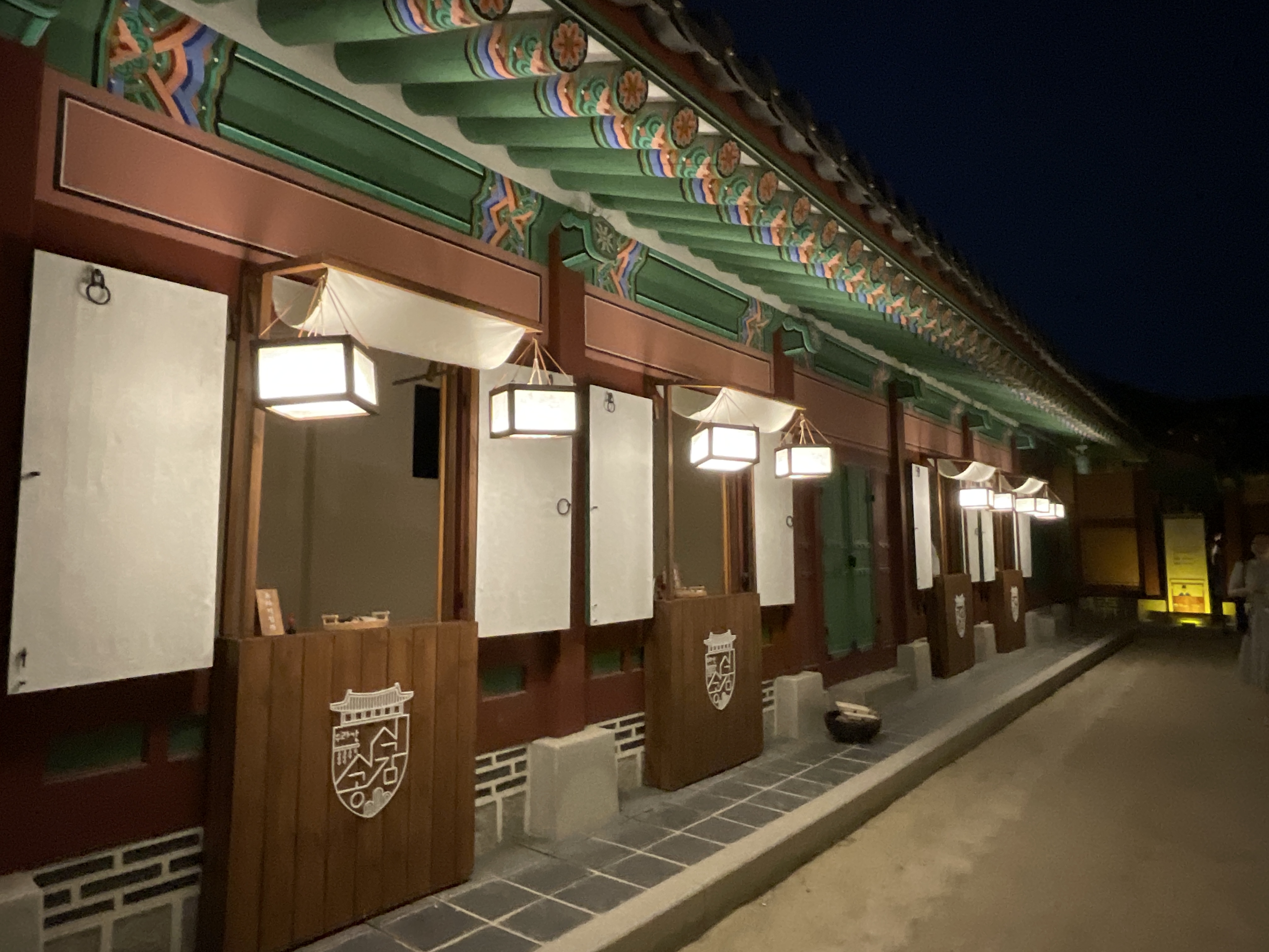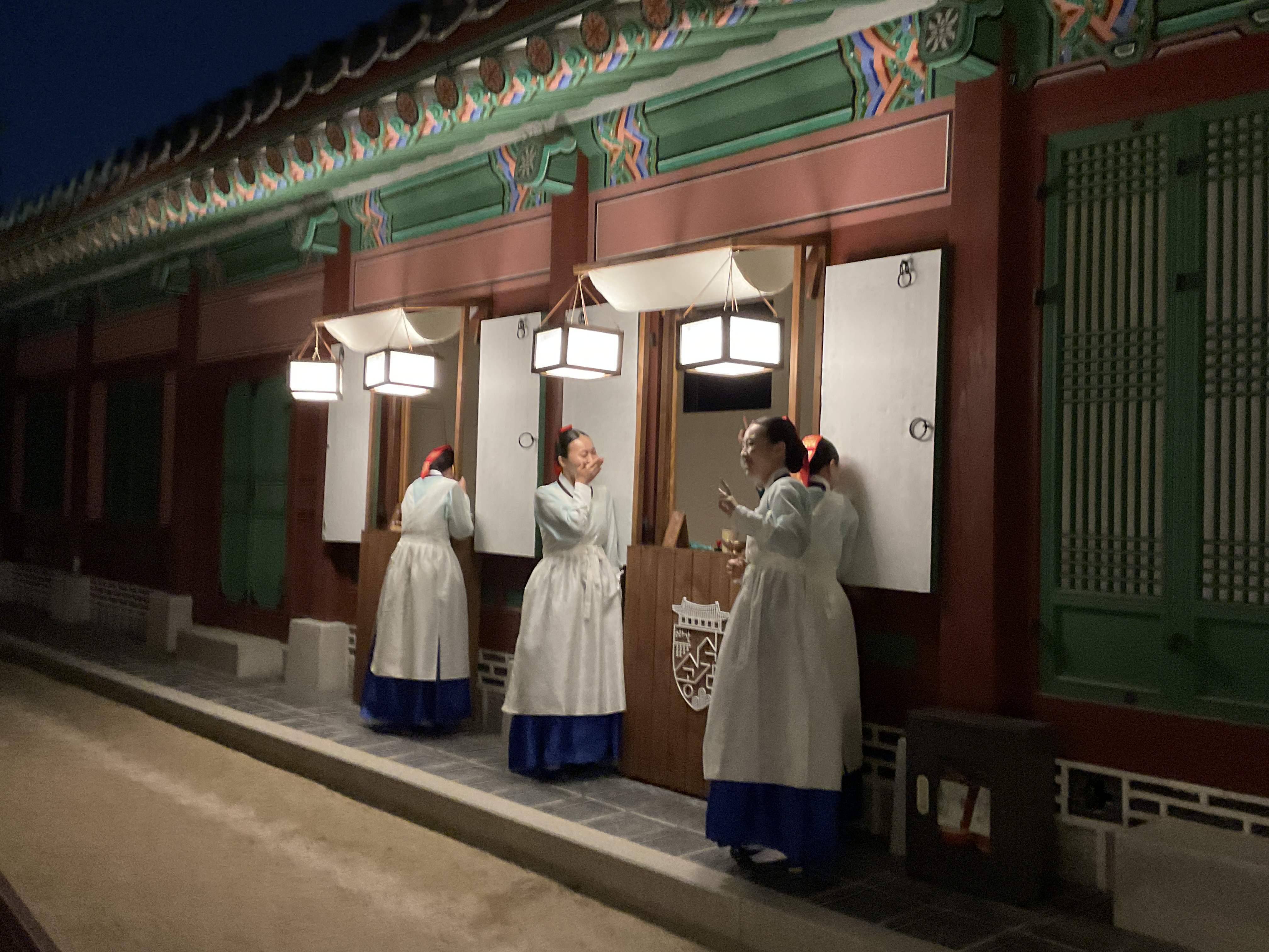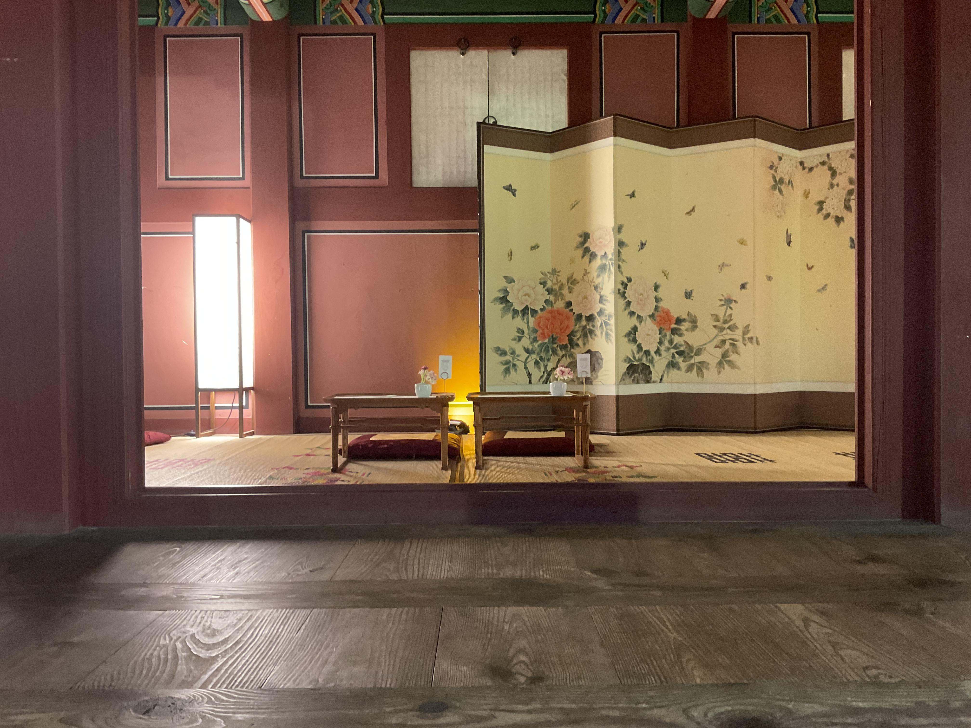 식사를 다 끝나고 난 뒤, 사람들빠지고 궁을 찍는데 야간에 보는데 너무 예뻐 여기저기 찍었다. 의자에는 앉아서 찍는게 부담스러워 의자와 궁 방만 곳곳 찍고 나왔다.