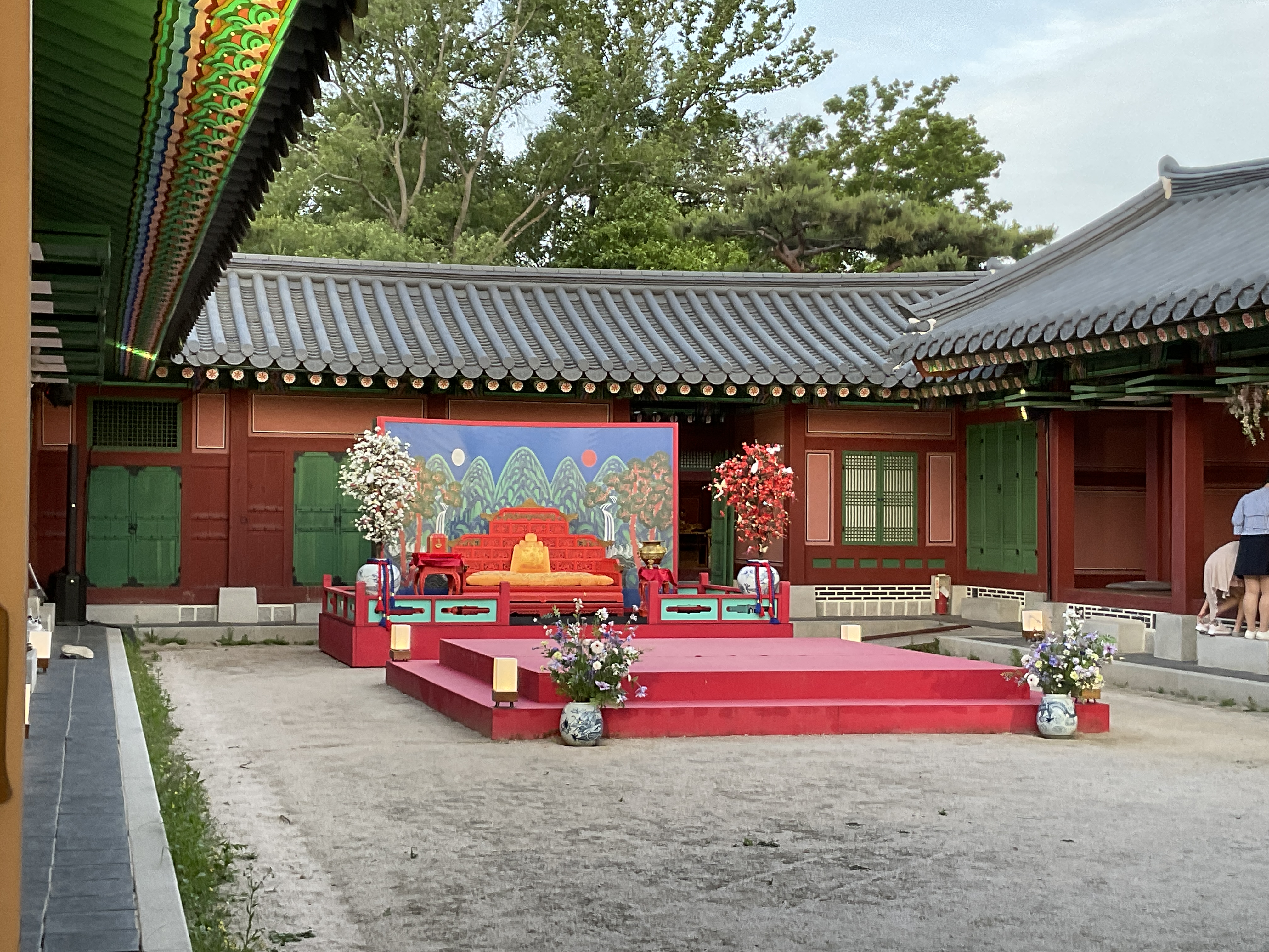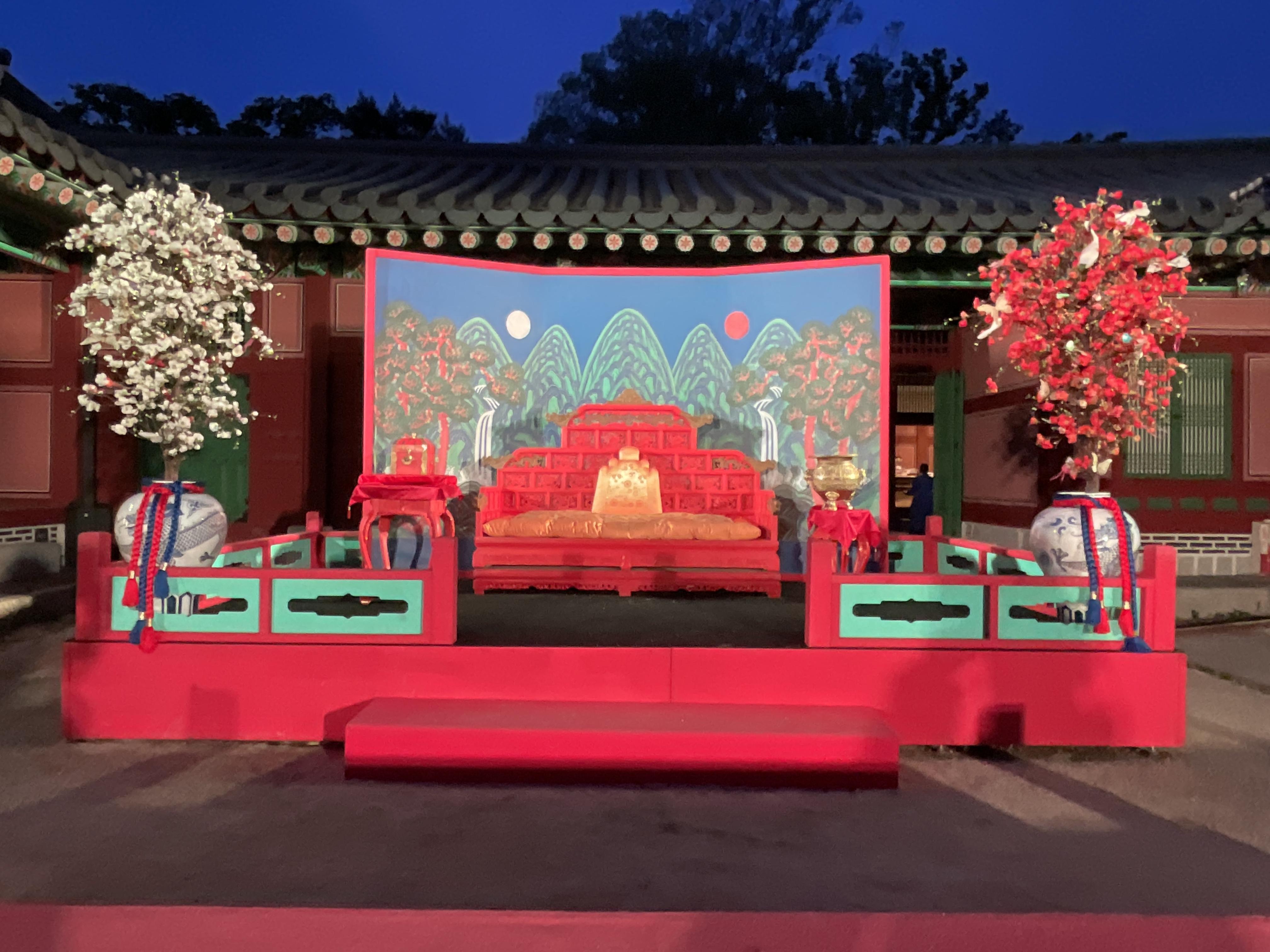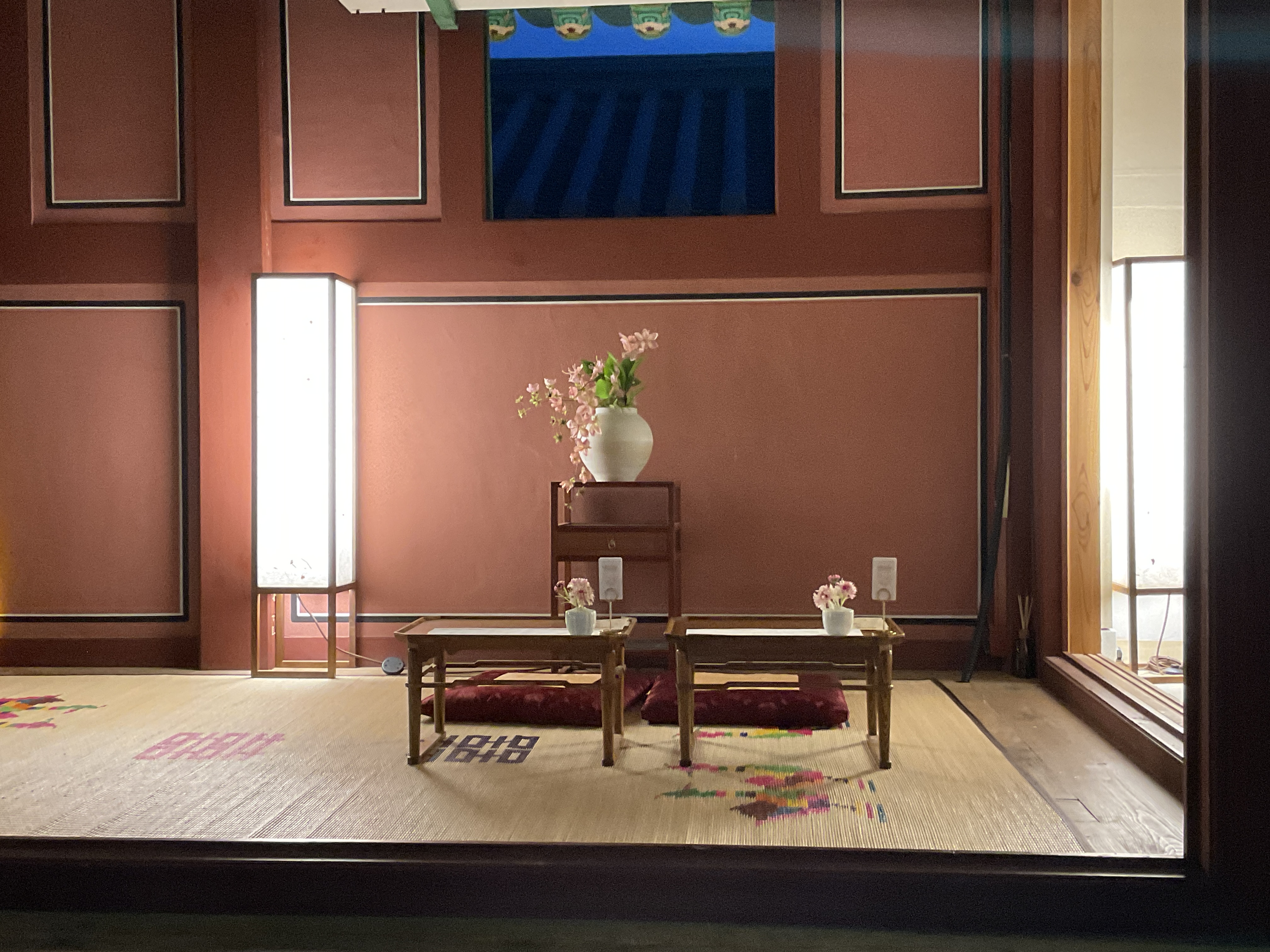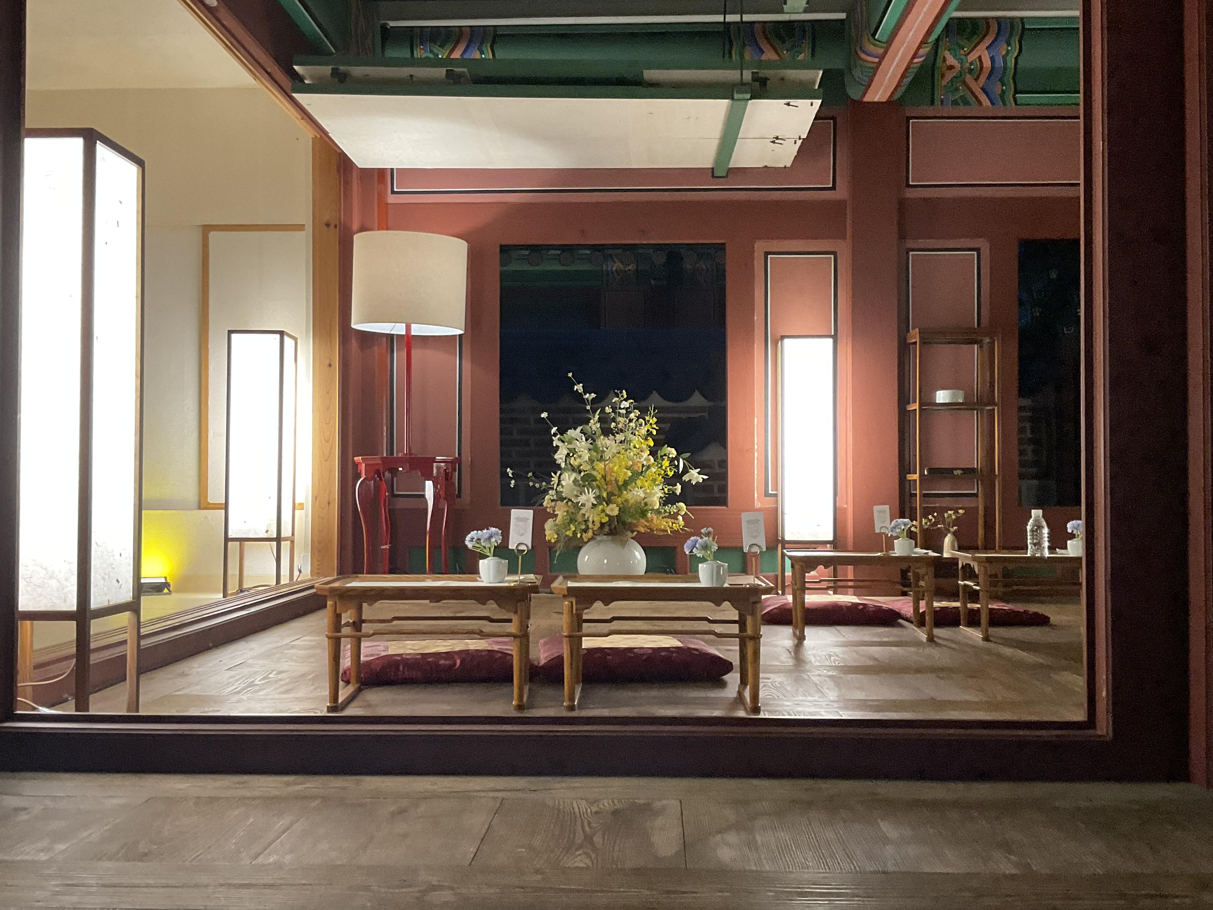 식사를 다 끝나고 난 뒤, 사람들빠지고 궁을 찍는데 야간에 보는데 너무 예뻐 여기저기 찍었다. 의자에는 앉아서 찍는게 부담스러워 의자와 궁 방만 곳곳 찍고 나왔다.