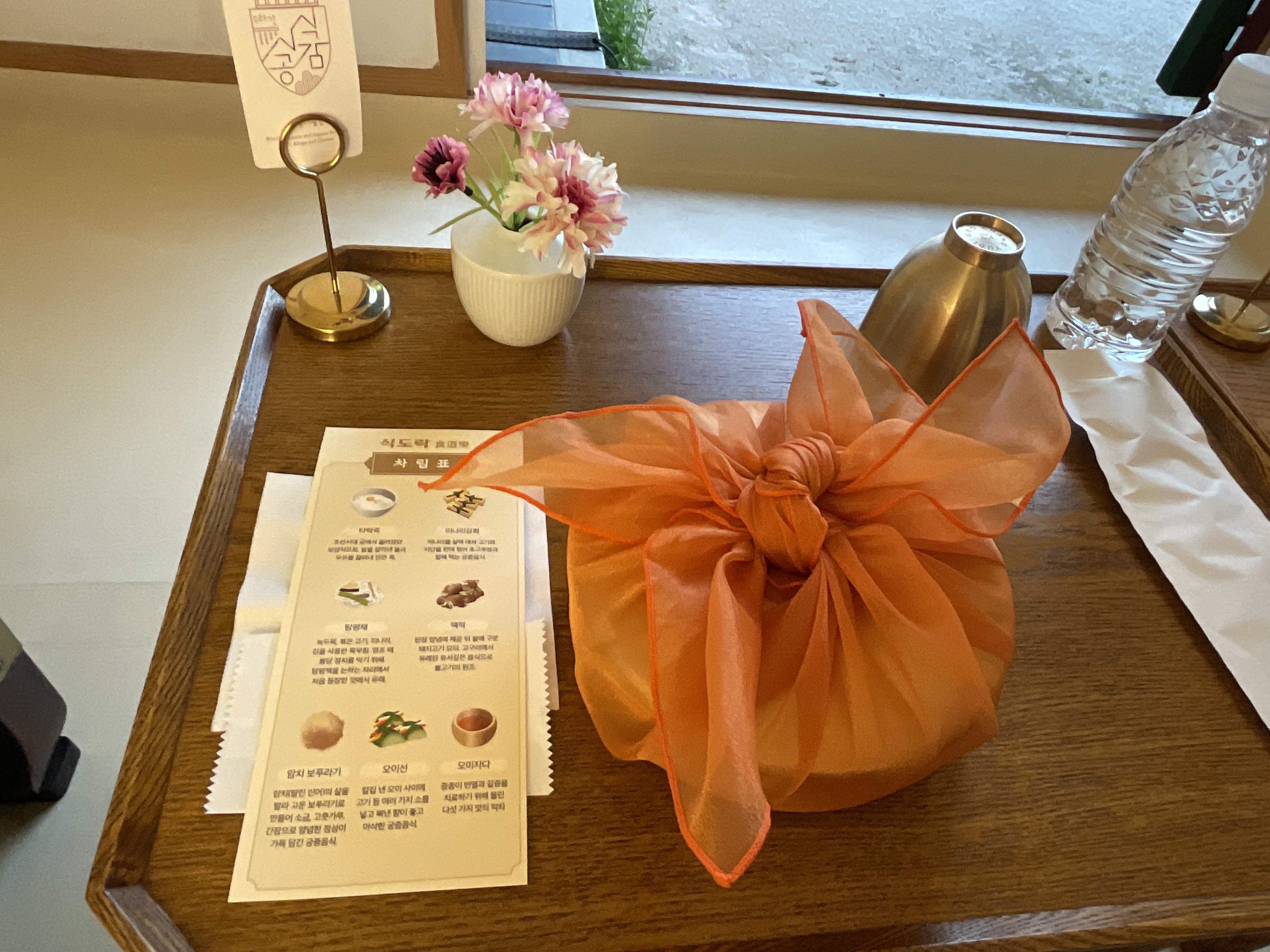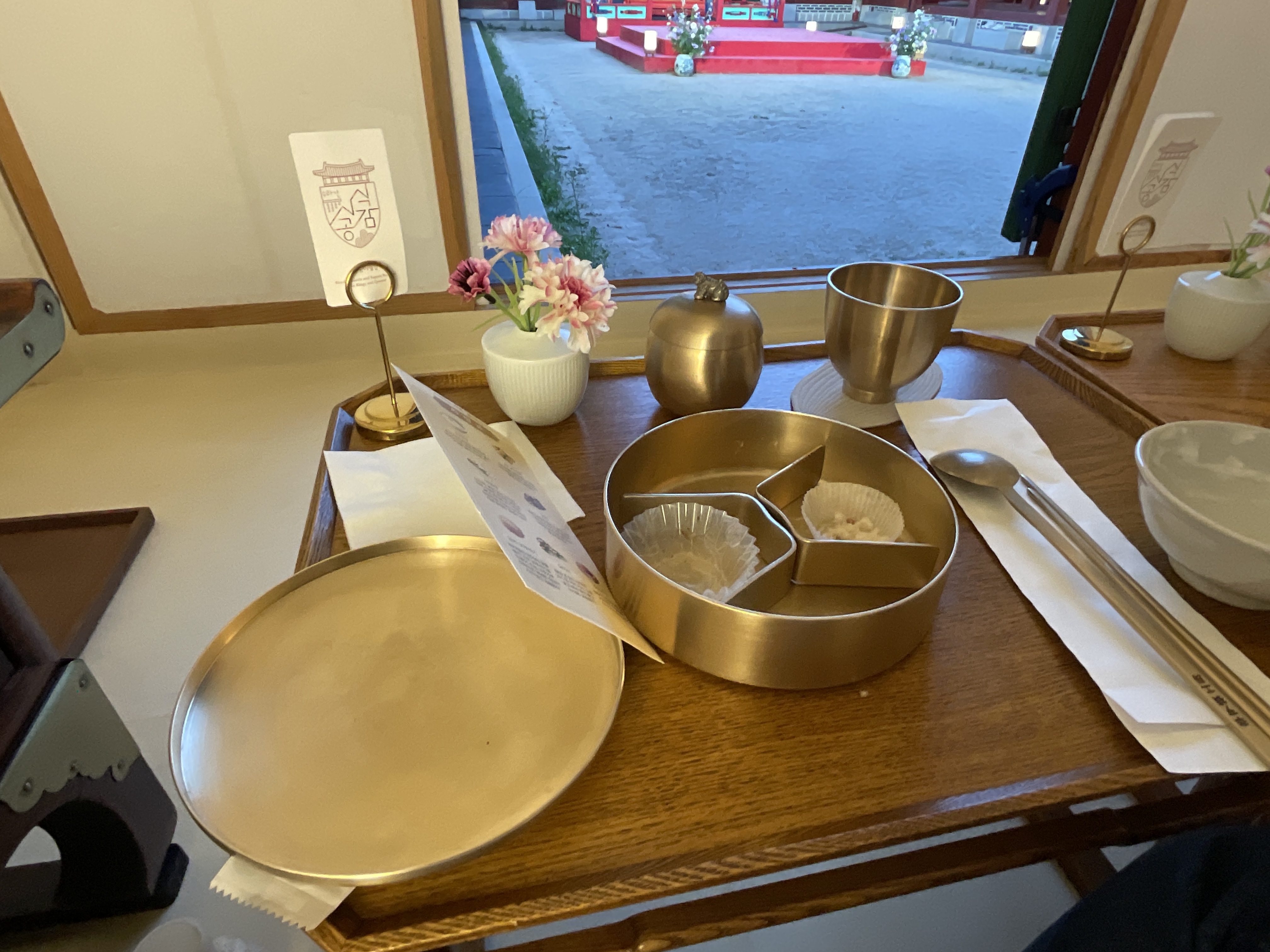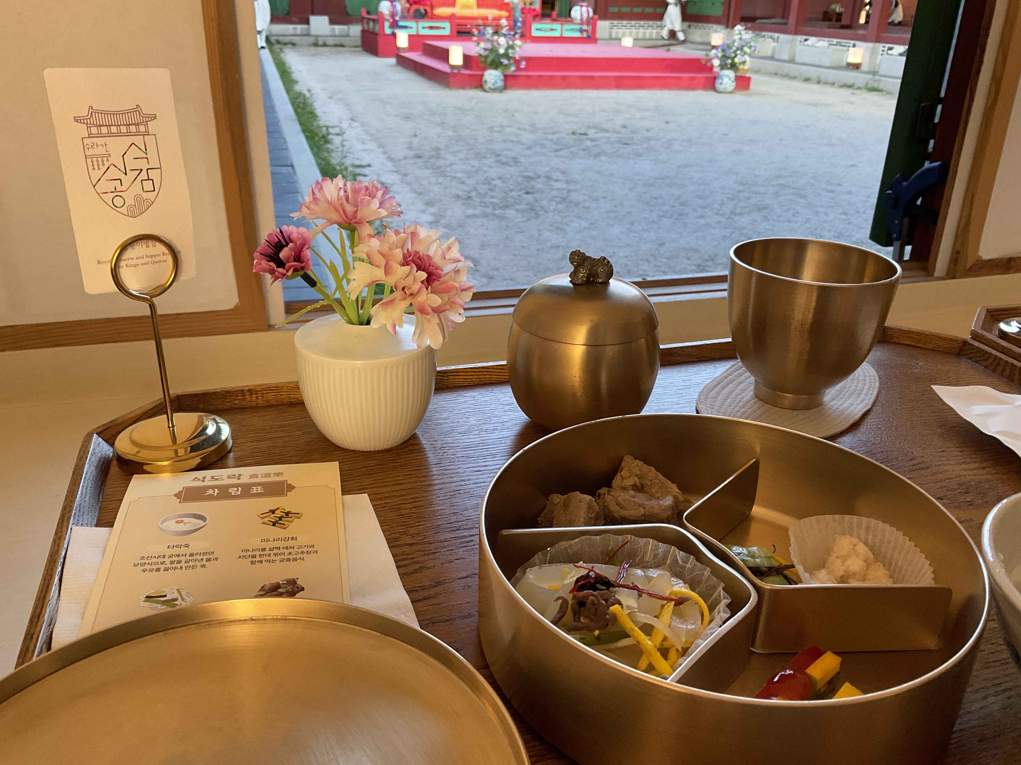 체험장소는 사람이 많아 수랏간 식사하는 곳에 왔는데 각 방에 상이 세팅되어 있어 여기서 가운데 무대를 보면서 식사하는데 좋았다. 우선 궁에서 공연보면서 먹는거라 가장 만족했다 상도 예쁘고 음식도 예쁘고ㅋ 양이 적은게 좀 흠이었는데