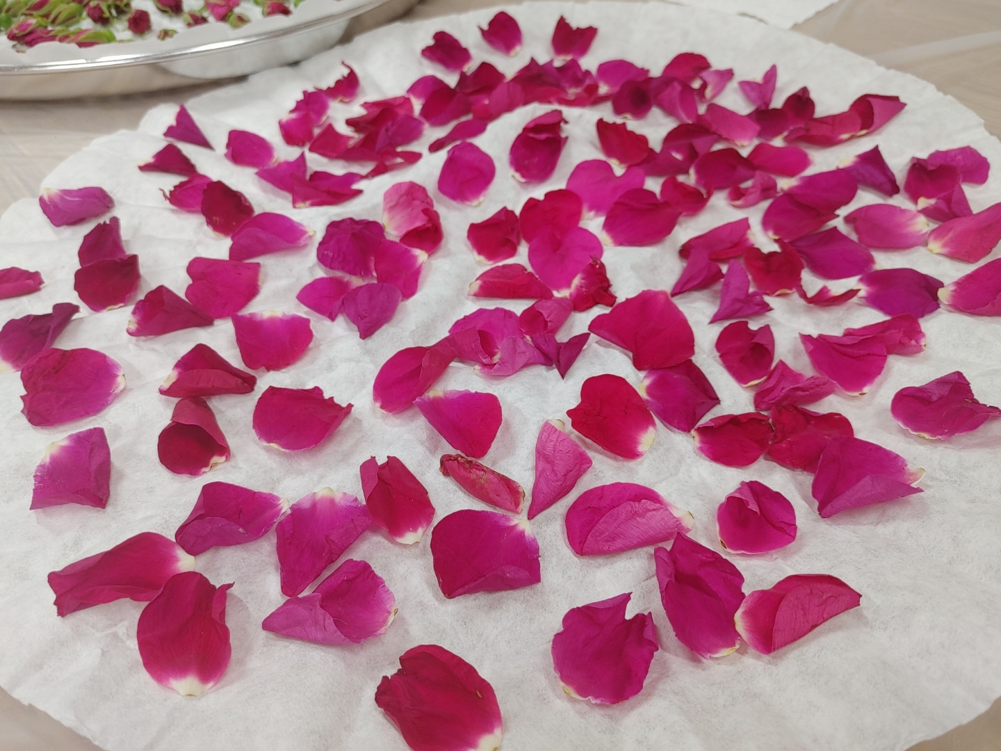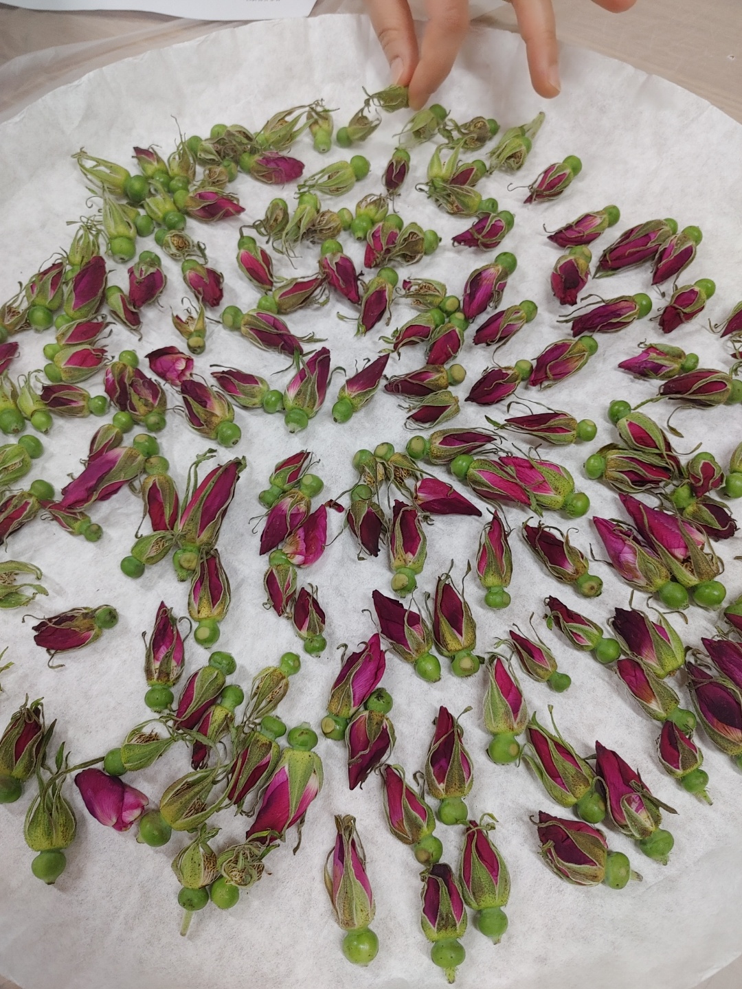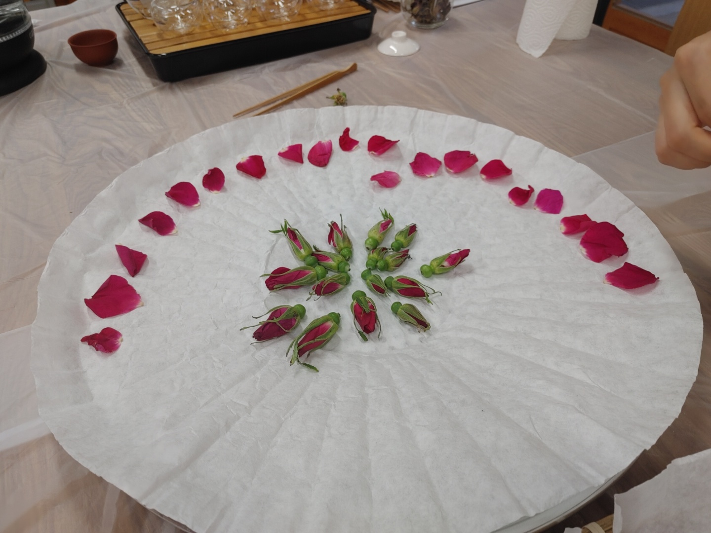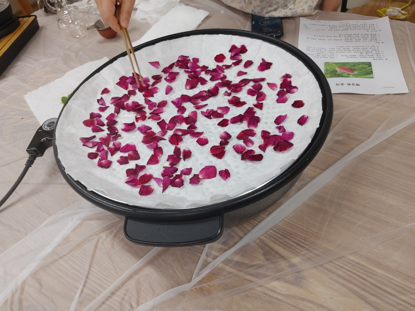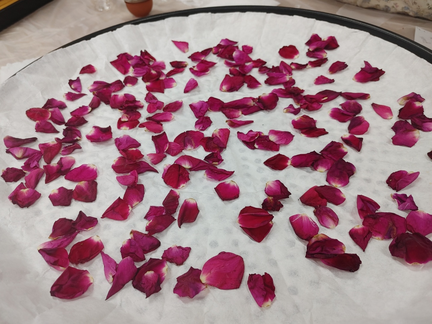 꽃은 많이 핀건 꽃잎만 분리해서 한지나 위의 그림처럼 대형 커피 필터지에 가지런히 곂치지 않게 나열하면된다. 오른쪽 맨끝에 있는 꽃받침은 파는용이 아닌 수제로 수강생끼리 먹는거라 이것도 같이 말려보자고 하셨다.