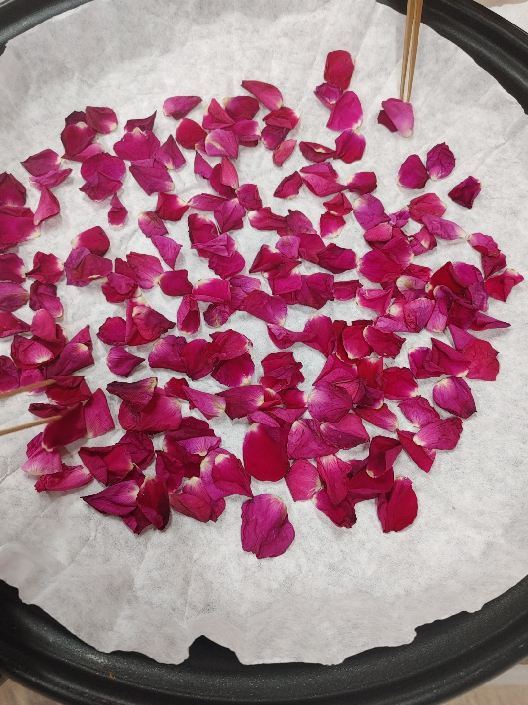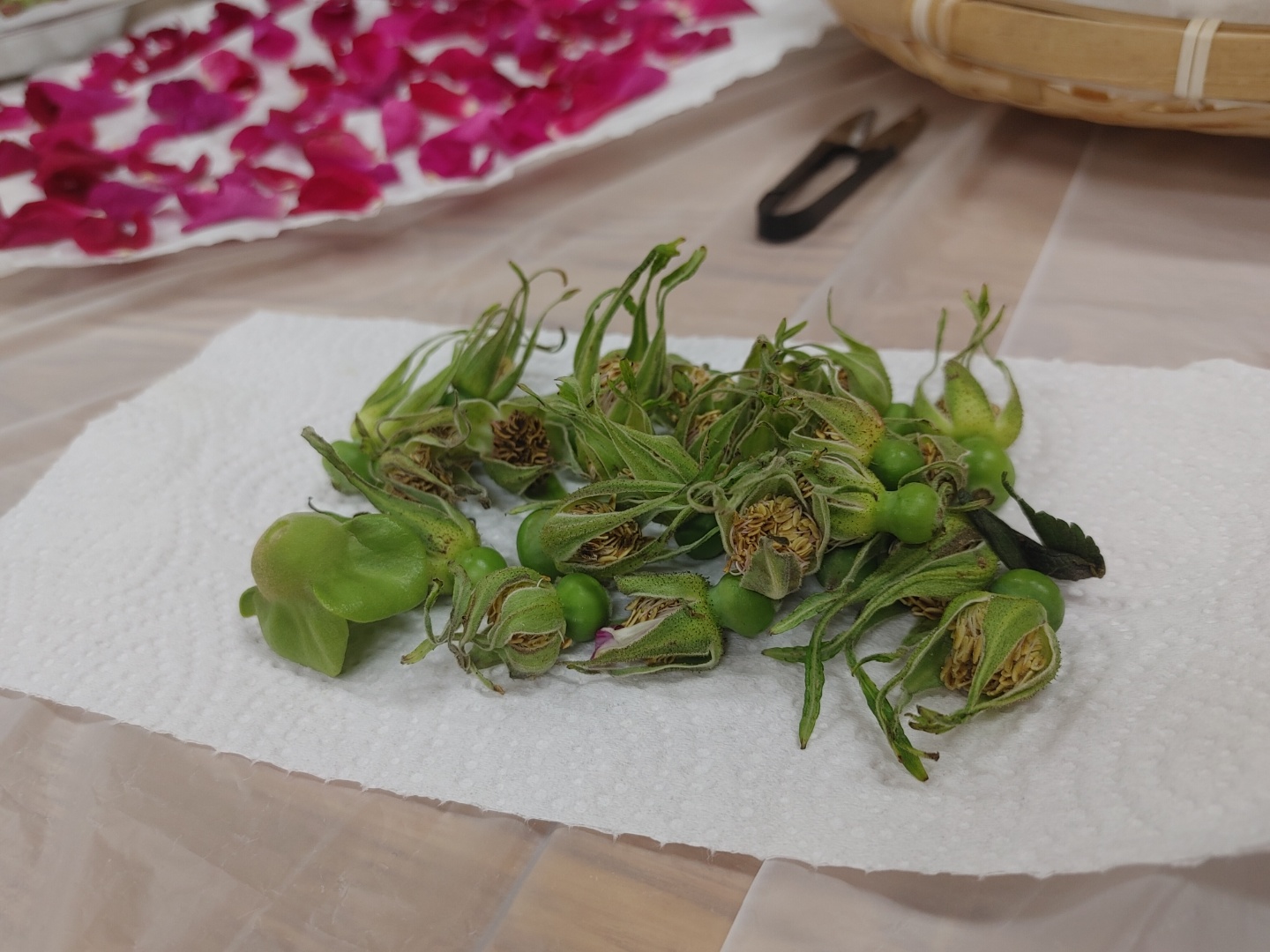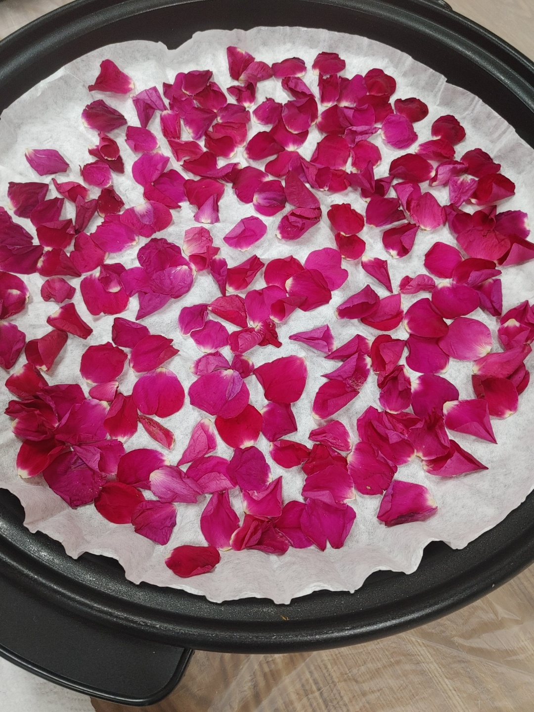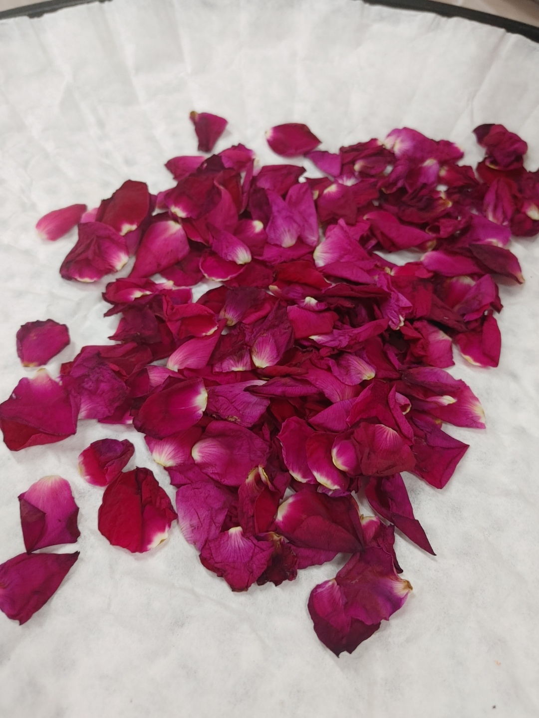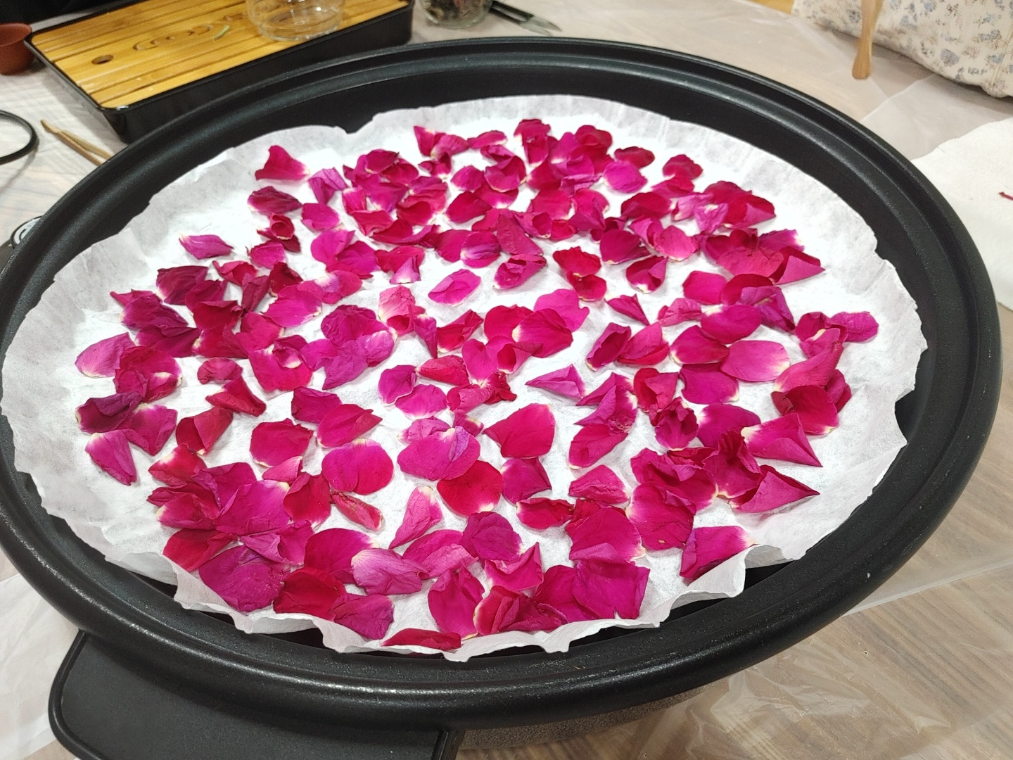 꽃은 많이 핀건 꽃잎만 분리해서 한지나 위의 그림처럼 대형 커피 필터지에 가지런히 곂치지 않게 나열하면된다. 오른쪽 맨끝에 있는 꽃받침은 파는용이 아닌 수제로 수강생끼리 먹는거라 이것도 같이 말려보자고 하셨다.