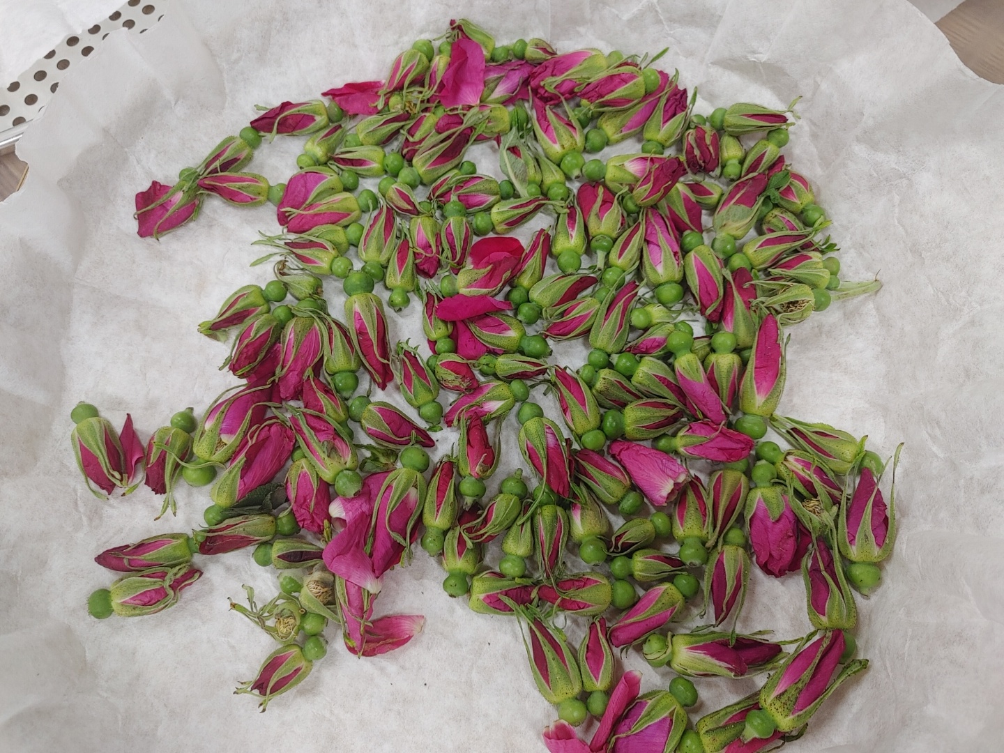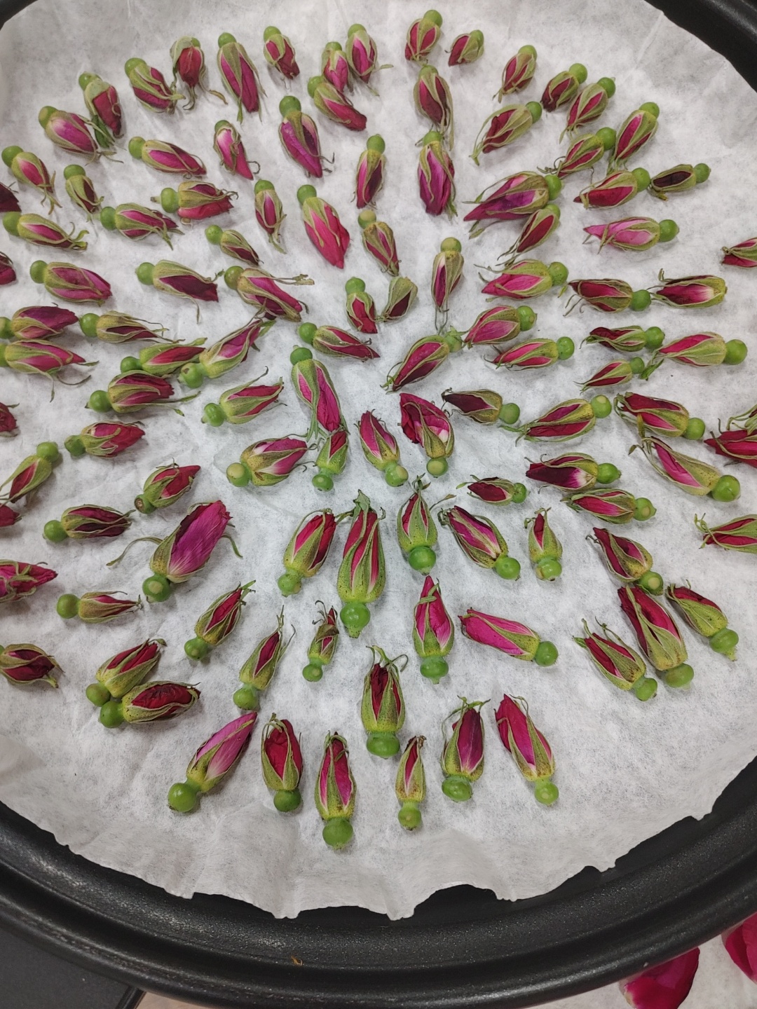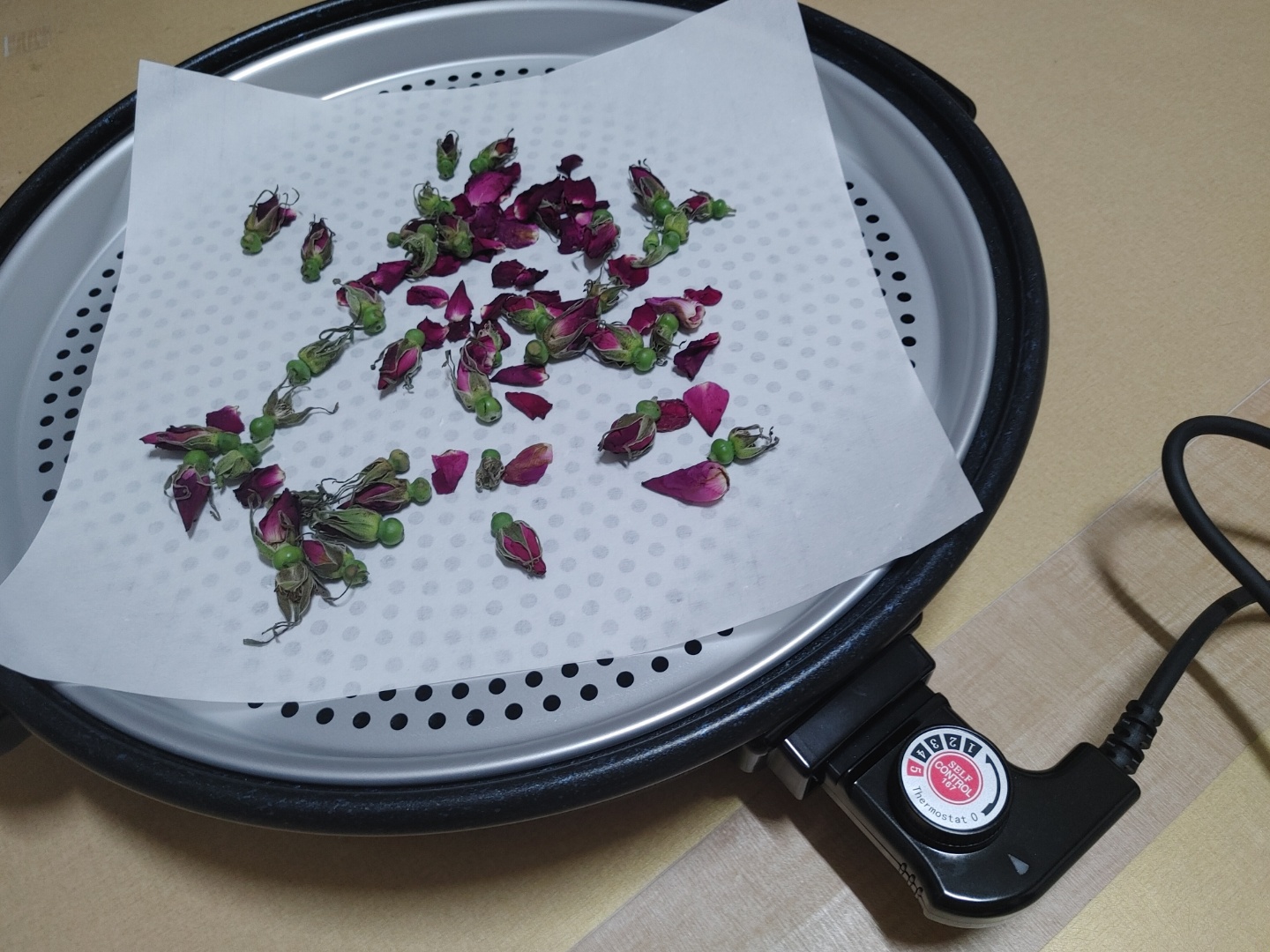 같은 형태끼리 모아서 덖어야 같은 속도로 뒤집기 좋다고 하셔서 끼리끼리 나눠서 팬위에 올리고 덖었다. 온도는 '0'에서 불이 켜지기 시작하는온도로 두면 올라갔다가 자동으로 꺼지다 한다. 한 5분에서 10분 올려두면 전체적으로 온기가 생기기 시작하면 집게로 뒤집고 5분정도 둔다음 팬 밖에 둬서 식힌다. 꽃이 얇아 5분에서 10분 방치하면 금방 식는다.