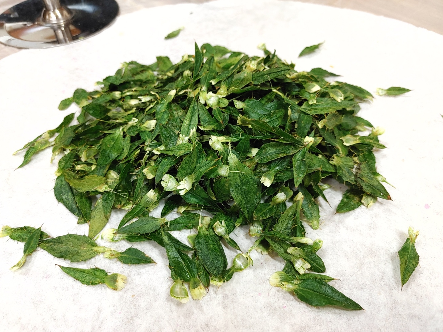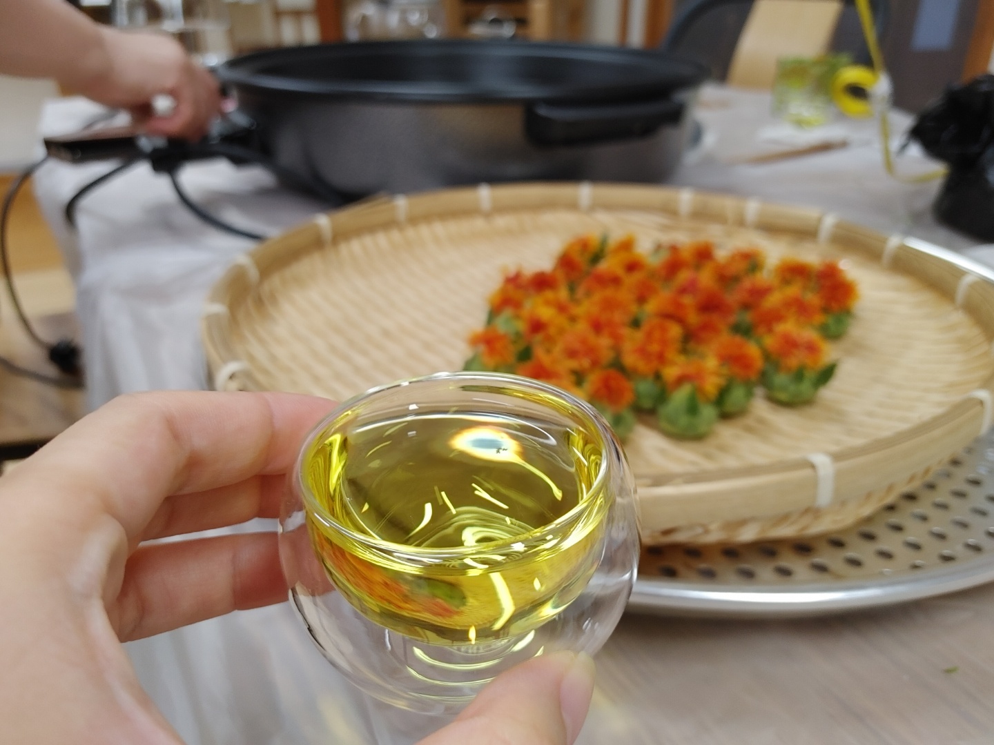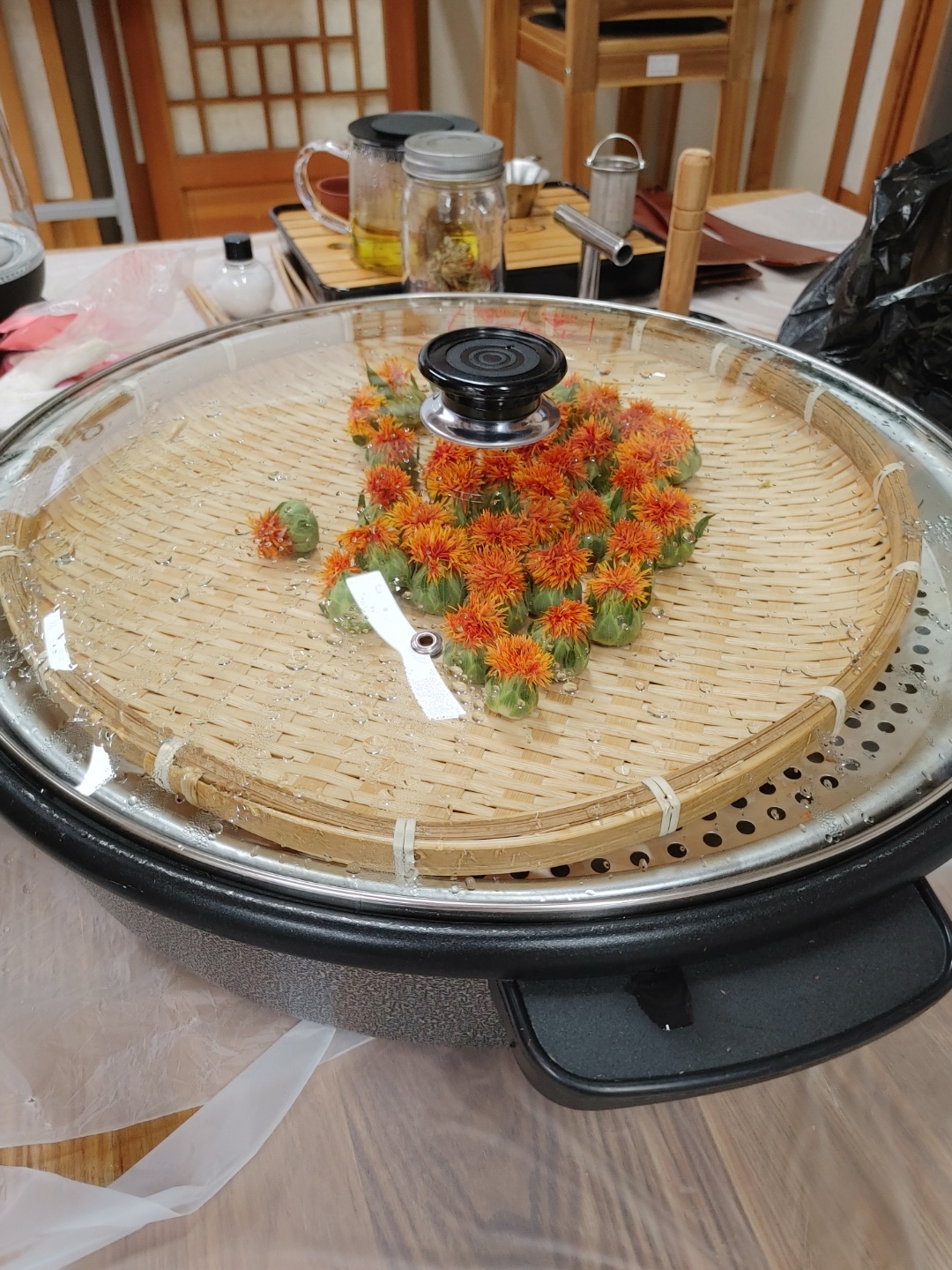 2.끓기 시작하면 대나무 채반에 얹어 놓은 꽃을 넣고 3분간 뚜껑 닫고 기다리다 꺼내서 손올릴때 촉촉하고 차가울때까지 식히는 것까지가 정제 작업이라고 한다. 이러면 덖을때 꽃이 바스라지는 걸 조금 덜 할 수 있게 한다고 한다.