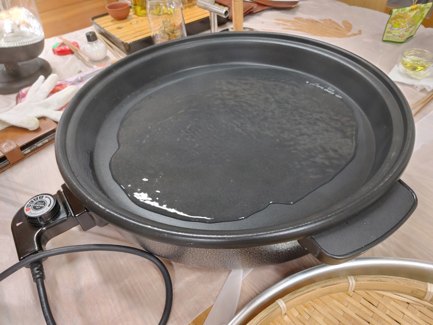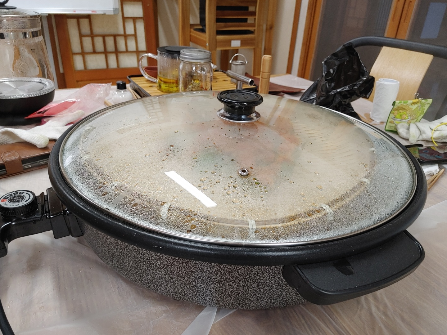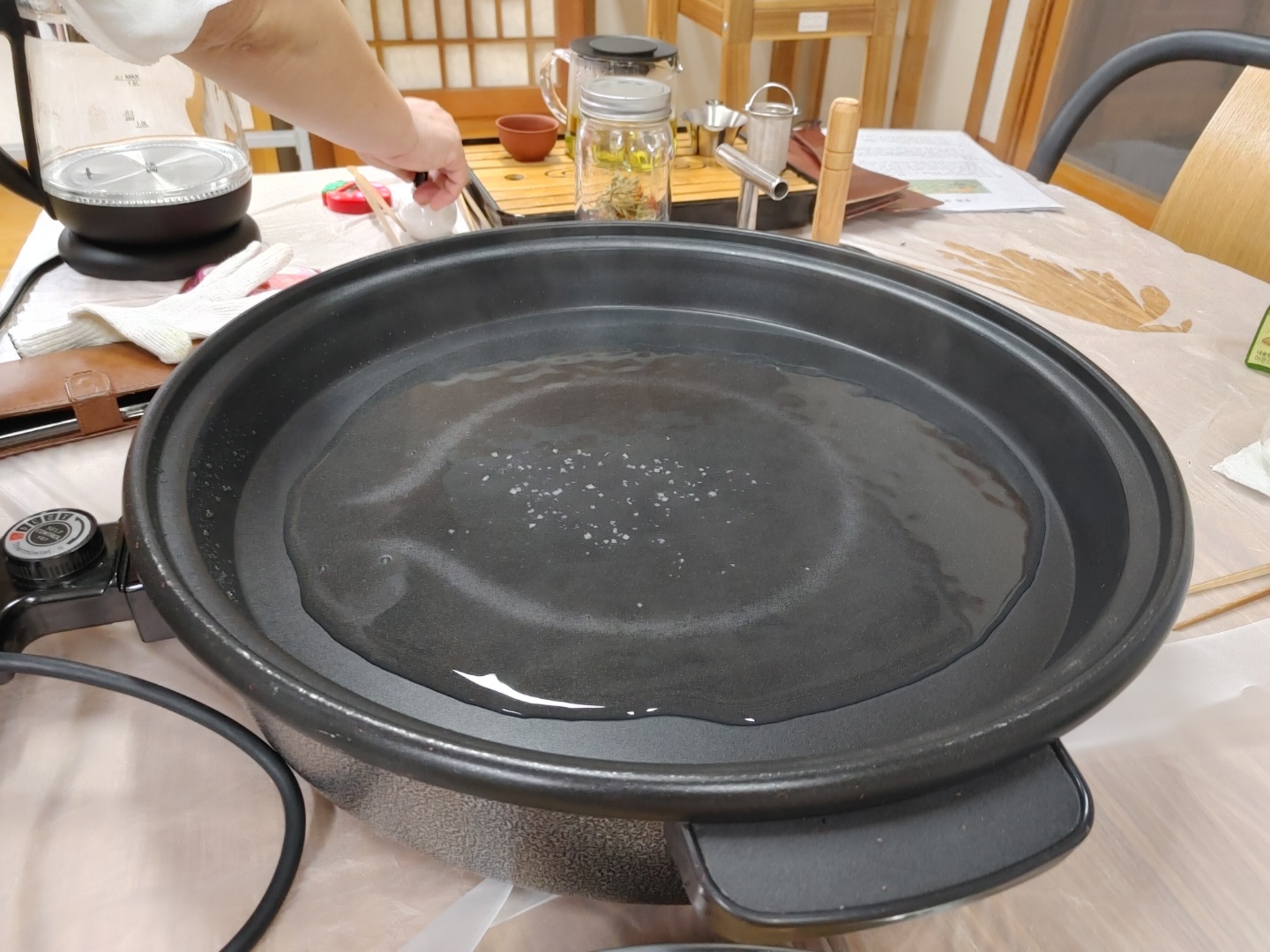 1.덖음 팬을 5도로 맞추고 물을 붇고 소금을 약간 넣어 팬의 물이 끓을때까지 뚜껑을 닫고 기다린다.