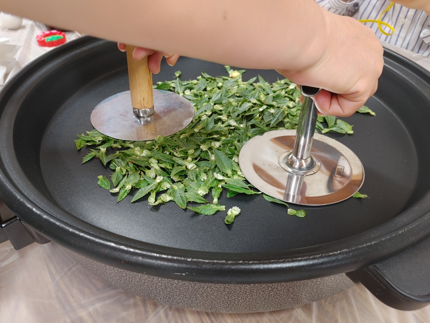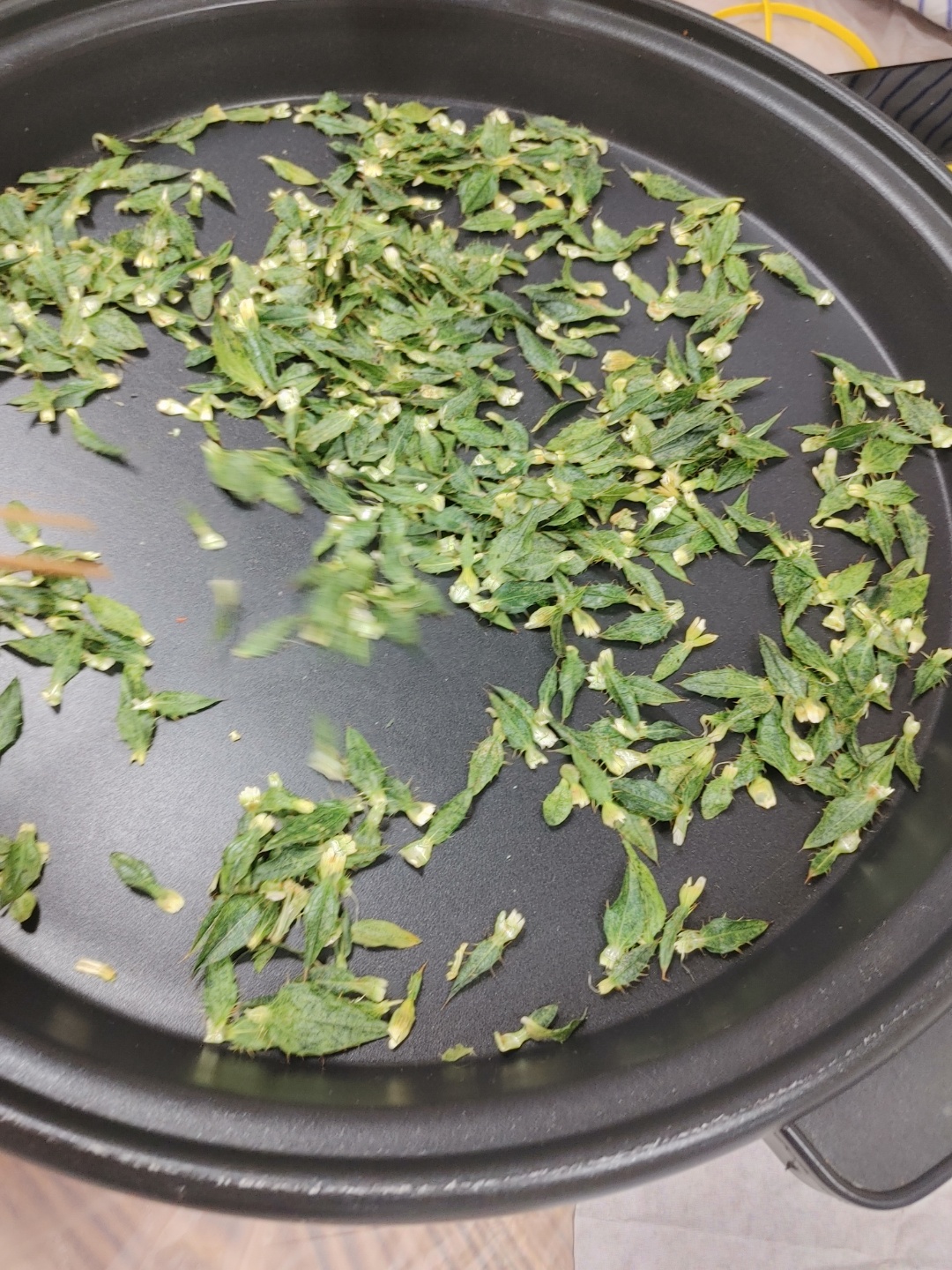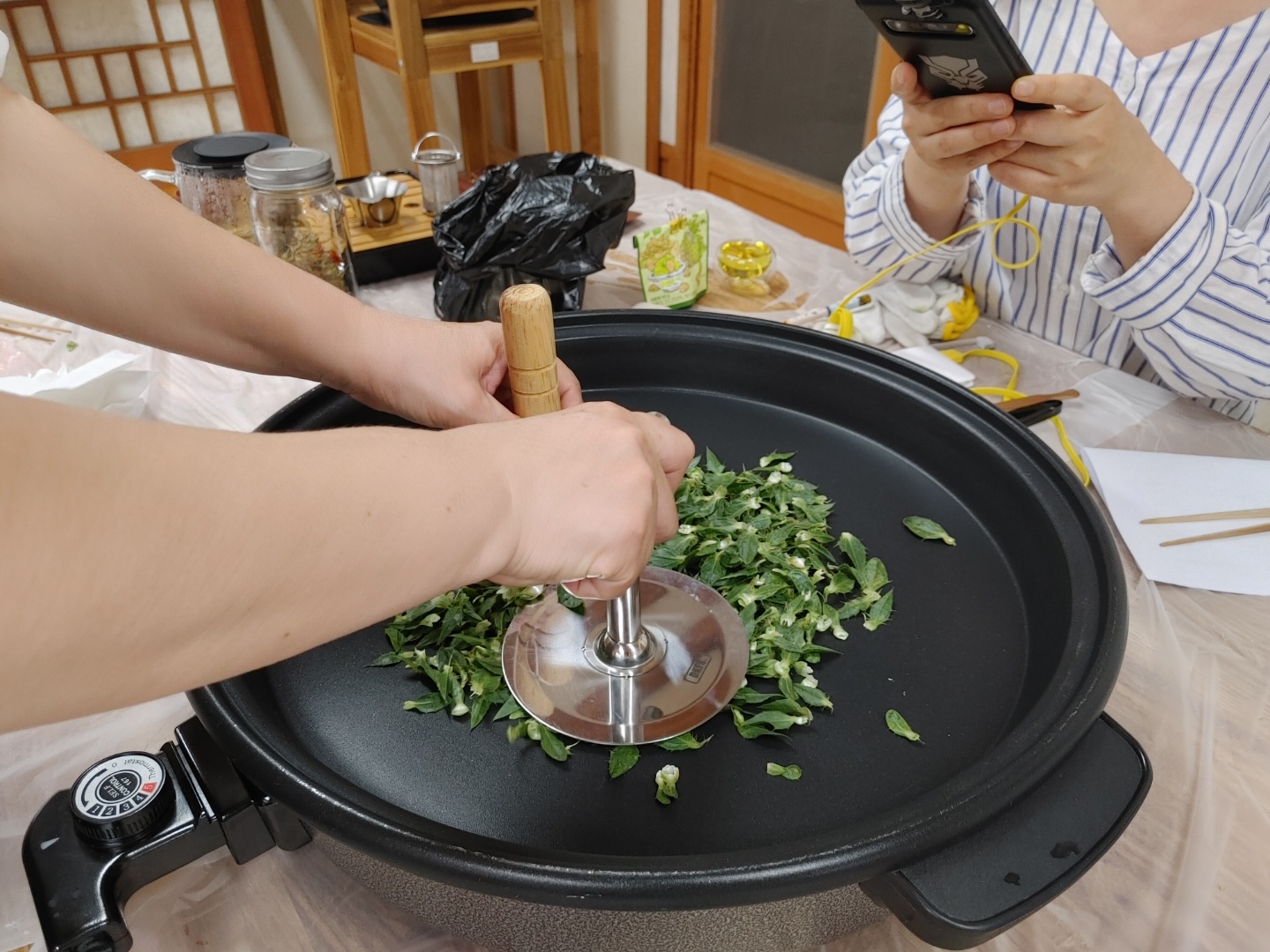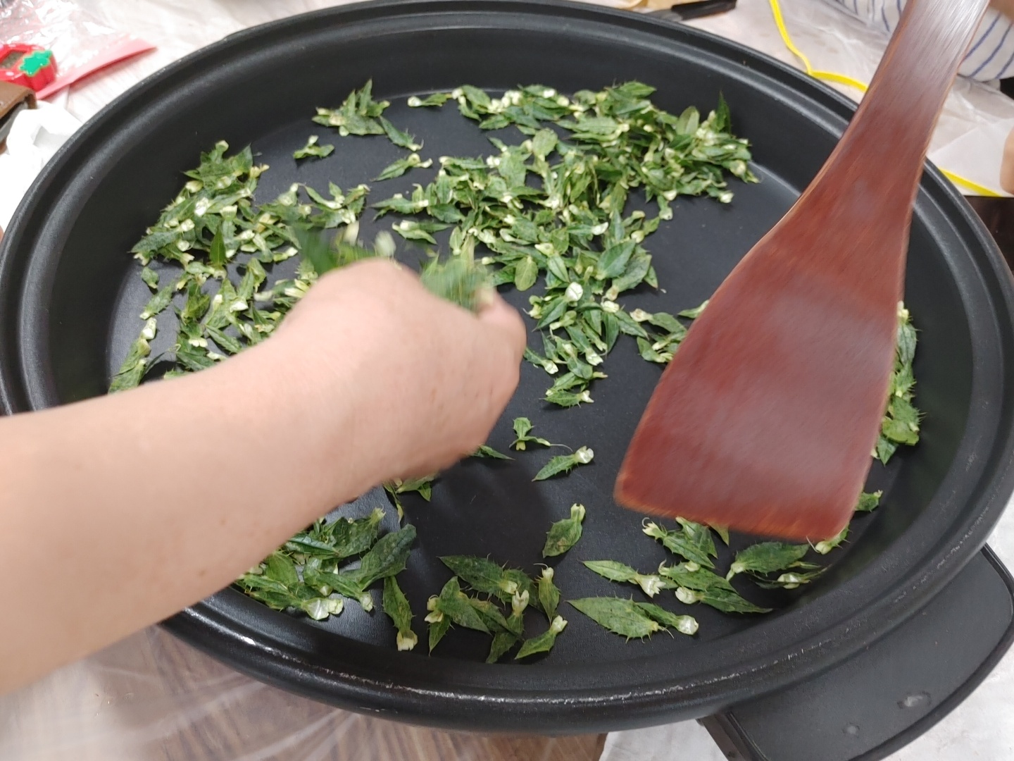 홍화 꽃 잎만들 때 잎사귀를 따로 모아둔다. 이건 위의 정제과정 없이 바로 직화 팬으로 간다. 0~1도 사이중 1에 가까이 온도를 맞추고 호떡 뒤집개? 달고나 누르는 도구 닮은 걸 준비해야한다고 한다. 이건 가시가 있어 아마린스 꽃차처럼 누르면 가시에 찔리 수 있는 위험이 있다고 했다. 그리고 바로 잎을 부어서 꾹꾹 누른다. 김이랑 스테이크 굽는 소리가 나기 시작한다.