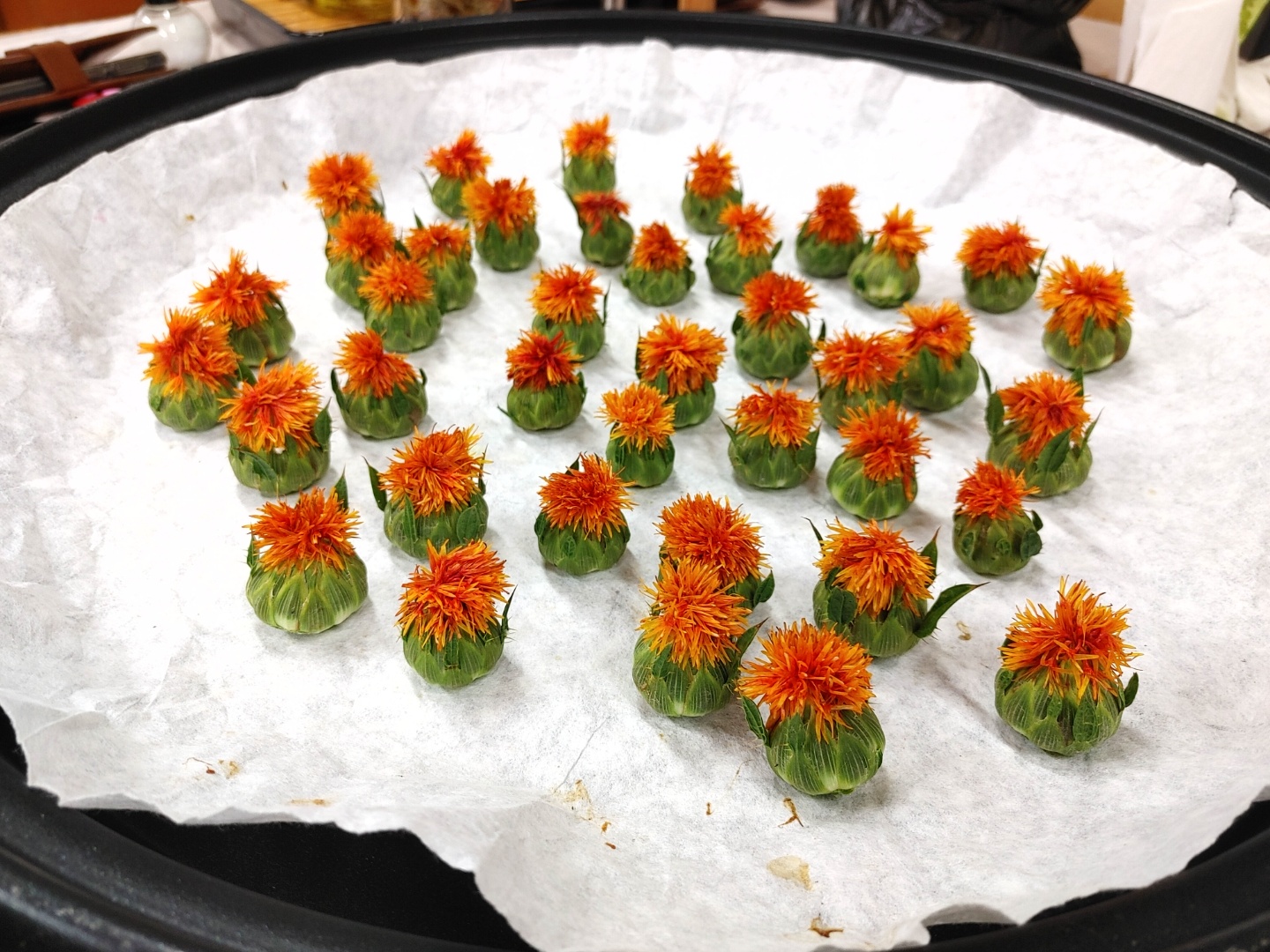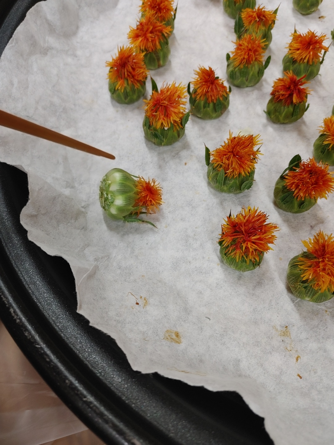 식히는 작업을 할 동안 덖음 팬을 0~1도 사이로 한다. 약 1/3 정도에 뒀는데 덖음 팬 브랜드마다 달라서 이것도 정확한 건 아니다. 식힌 꽃을 물기를 제거한 덖음 팬에 직화로 커피필터지(없으면 난 화선지로 집에서 한다) 올린다. 이건 뒤집으면 꽃이 망가져서 옆으로 굴려서 익히다. 다시 똑바로 세워 열이 따끈따끈해지면 다시 식힘 작업을 한다. 옆으로 눞힘 세움 작업해야 주황 꽃 부분이 안망가지면서 점점 말라간다고 한다. 이건 씨방이 커서 온도 높여서 하는 거고 꽃마다 작업 방법이 다르다고 하셨다. 3번 정도 반복 작업했고 집에서는 타공팬위에 화선지 깔고 0도에 맞춰서 밤 10시 부터 다음 날 퇴근 할때까지 뚜껑열고 방치하니 다 말라 뚜껑닫고 향매김 작업하고 있다.