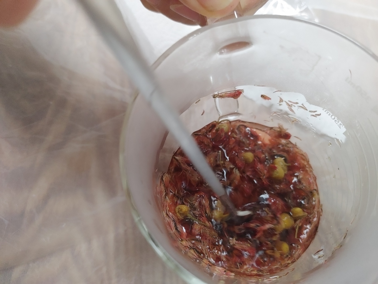 1. 맨드라미꽃차를 넣은 후 끓인 물 넣고 15초 정도 섞어준다. 스푼으로 색이 말 우러나게