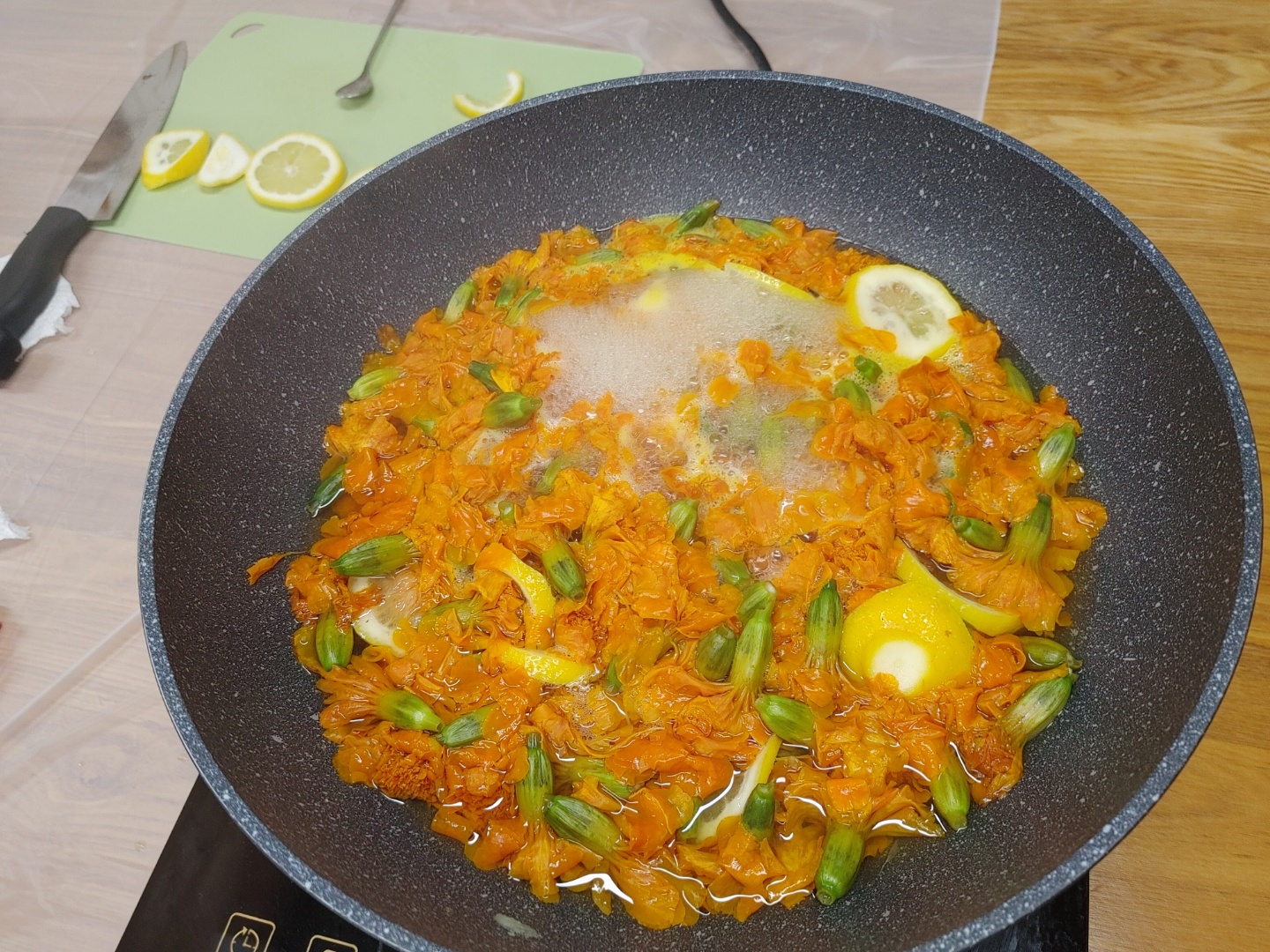 1. 꽃 300g, 물, 레몬(슬라이드) 반개, 을 냄비에 넣고 전체가 기포가 올라올 때까지 끓인다. (10~15분)