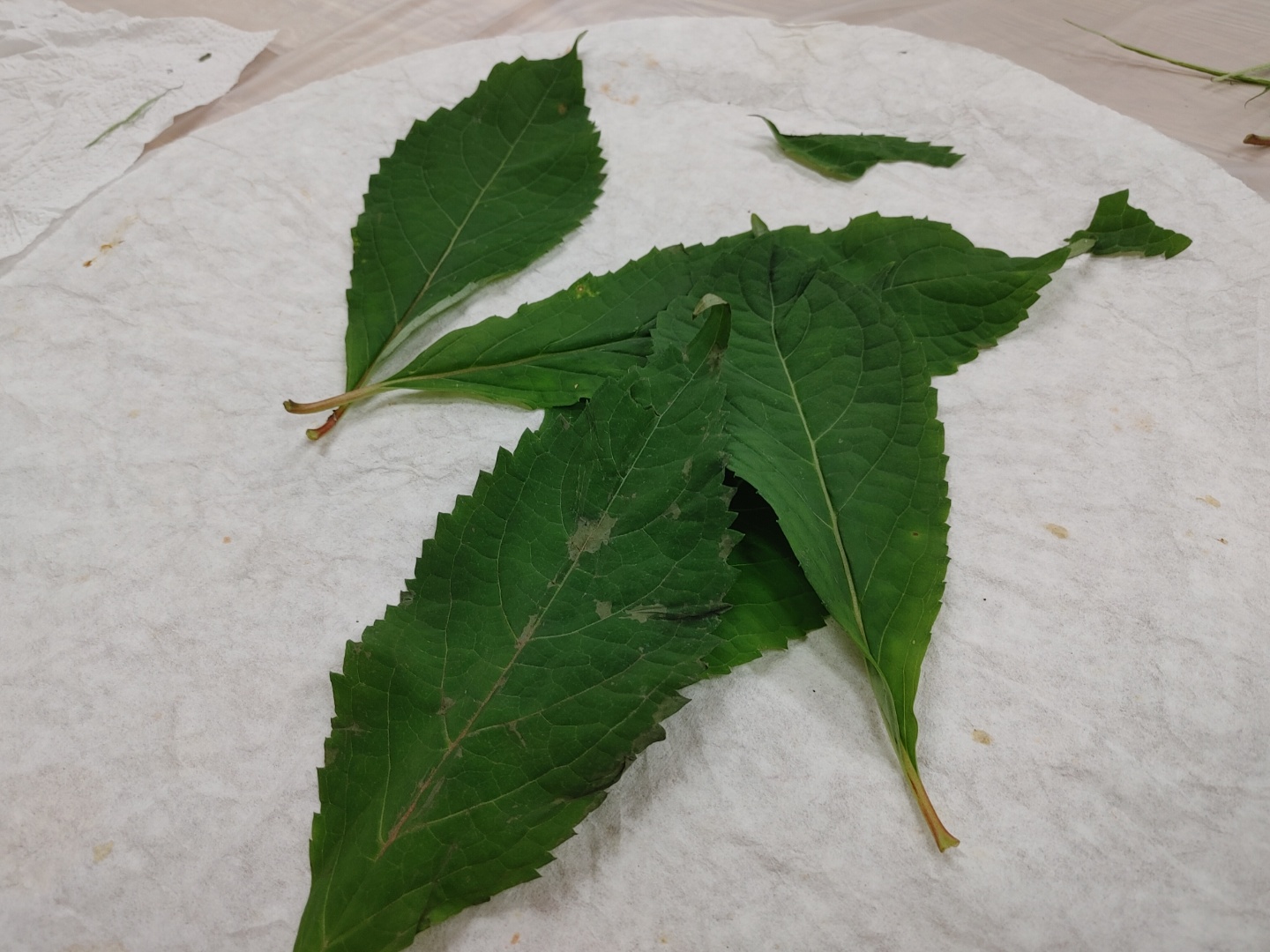 2.산수국 잎의 단단한 줄기 제거하고 충분히 유념한다.(유념은 보통 면포에 싸매서 상처입히는 작업인데, 이번에는 잎을 하나하나 비벼서 즙이 나올정도로 만들었다. )