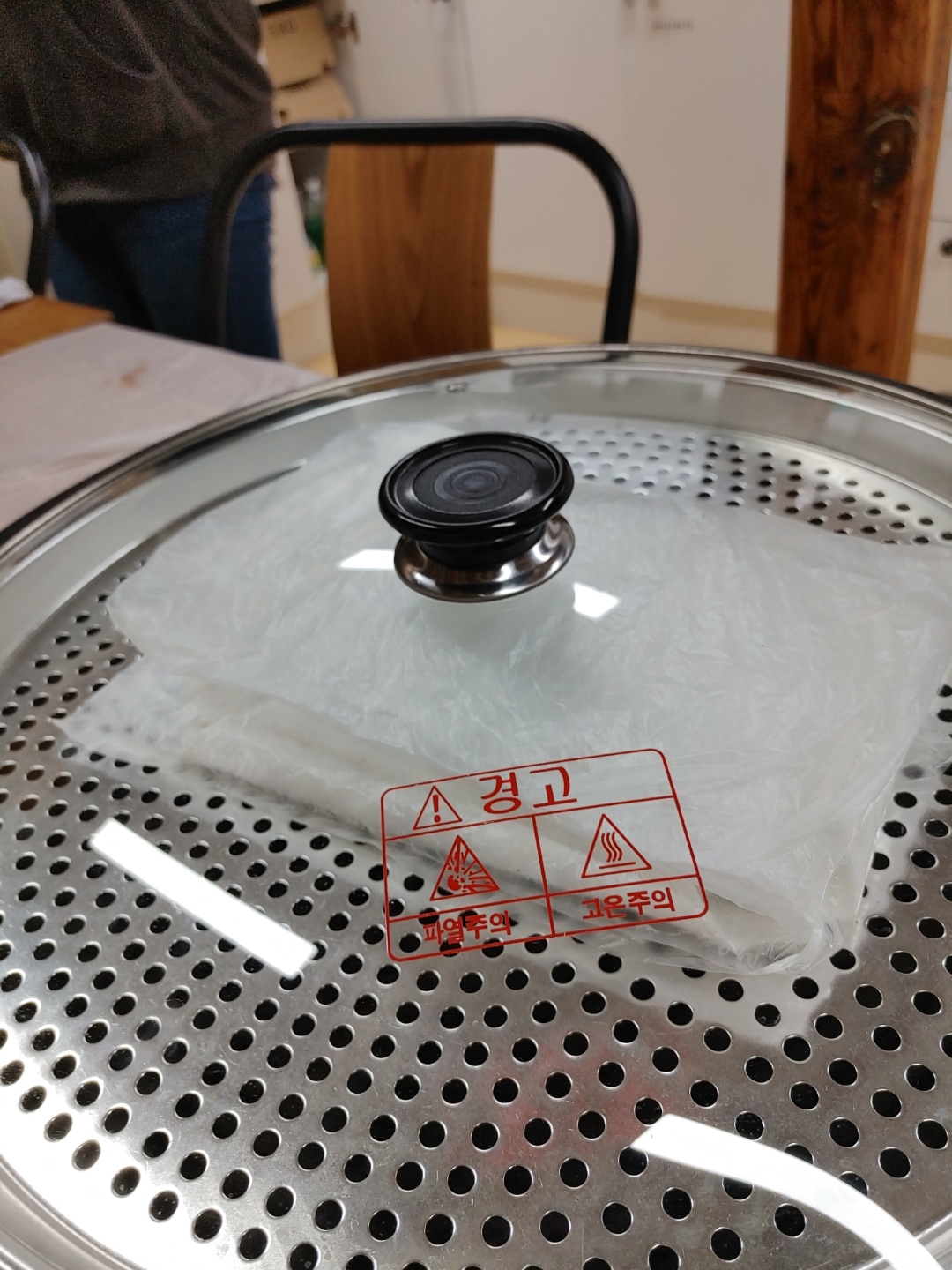 5. 팬 온도 F점에서 뚜껑닫아 수분 체크 후 없으면 그대로 향매김 안되있으면 뚜껑열고 타공판 위에 면포 혹은 한지 깔고 올려 말림 후 다 마르면 향매김 하면 끝난다.
