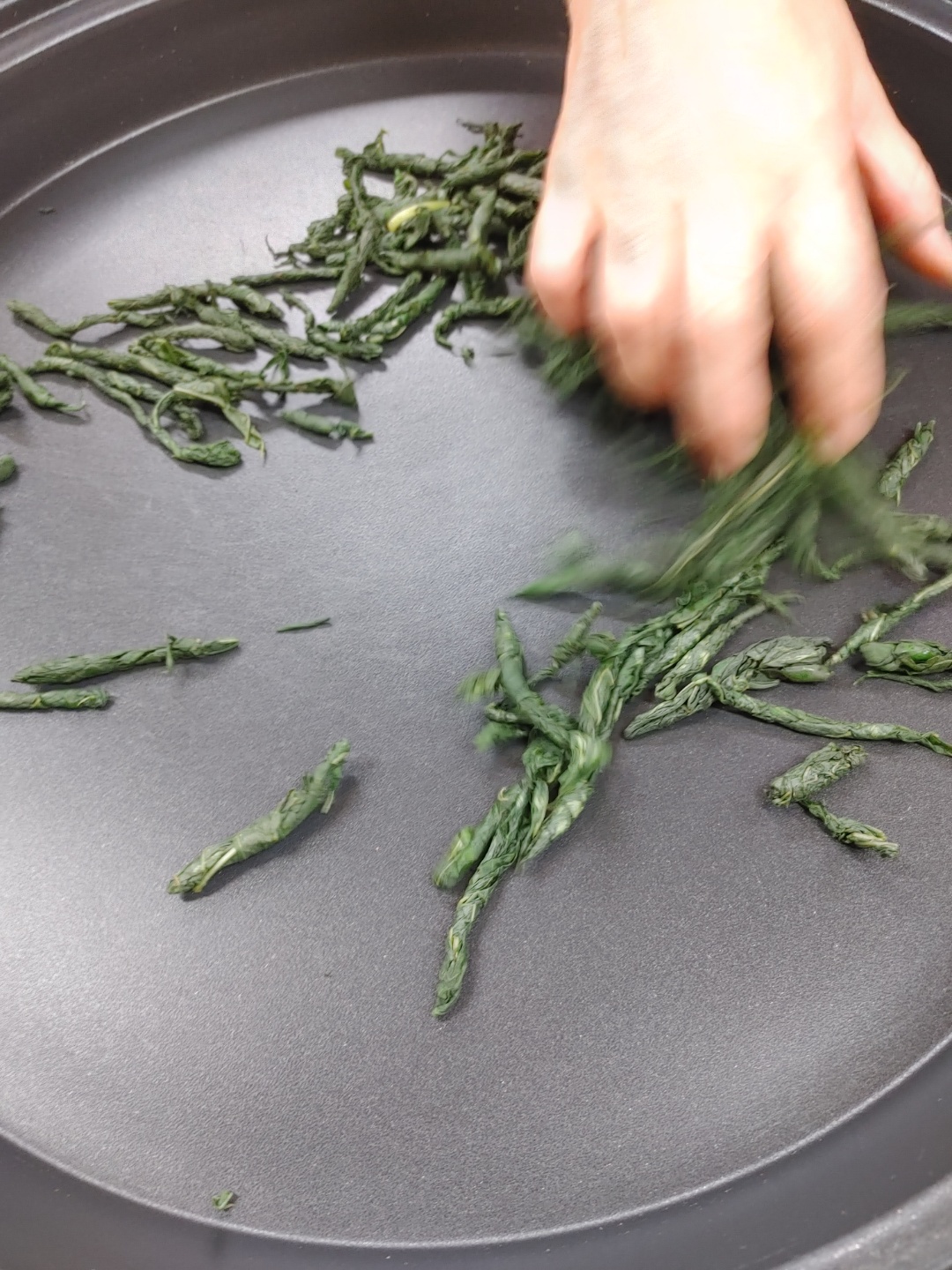 3. 유념한 산수국 잎은 면포, 없으면 키친타월에 싸매고 비닐에 넣어 온도 35도(꽃차 팬 온도 f)에 3-4시간 발효해준다.