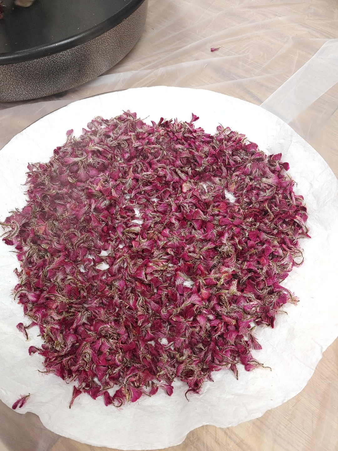 (아닐 경우)그 뒤 꽃은 키친타올이나 면포에 물을 묻혀 벌레나 먼지 등을 털어내고 줄기에 가까운 부분은 제거하고 꽃을 잘게 찢어 손질한다. 2~3mm 정도로