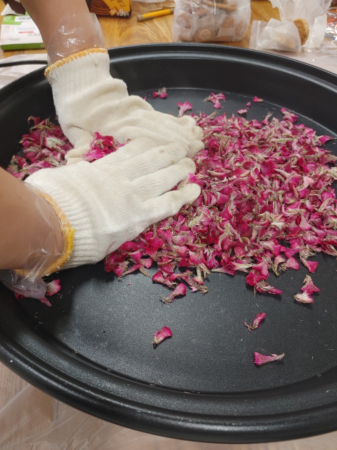 2. 손질한 맨드라미는 팬온도 1~2 사이에 올려 살청한 수 식힘한다. (상태보고 1~2회 정도)