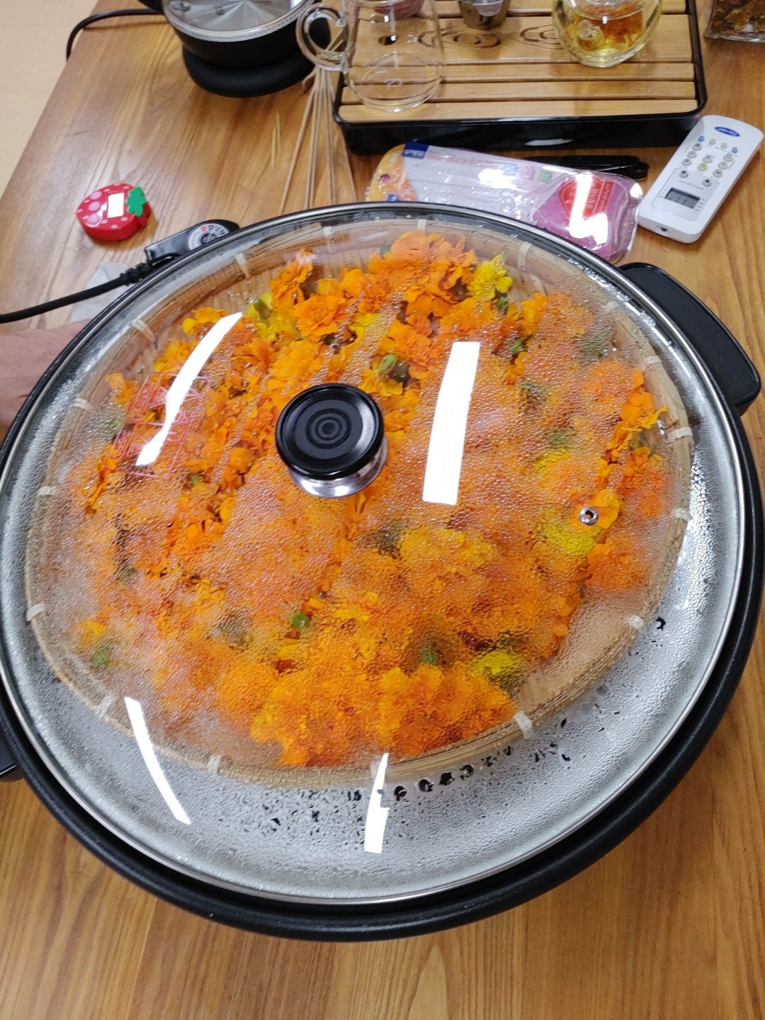 3. 팬온도 중온에서 연건하여 수분을 없애준다. (덖음과 식힘 반복) 0~1사이에 온도를 두고한다. 꽃의 수분이 80%정도 날라갔을 때 고온으로 덕음한다.